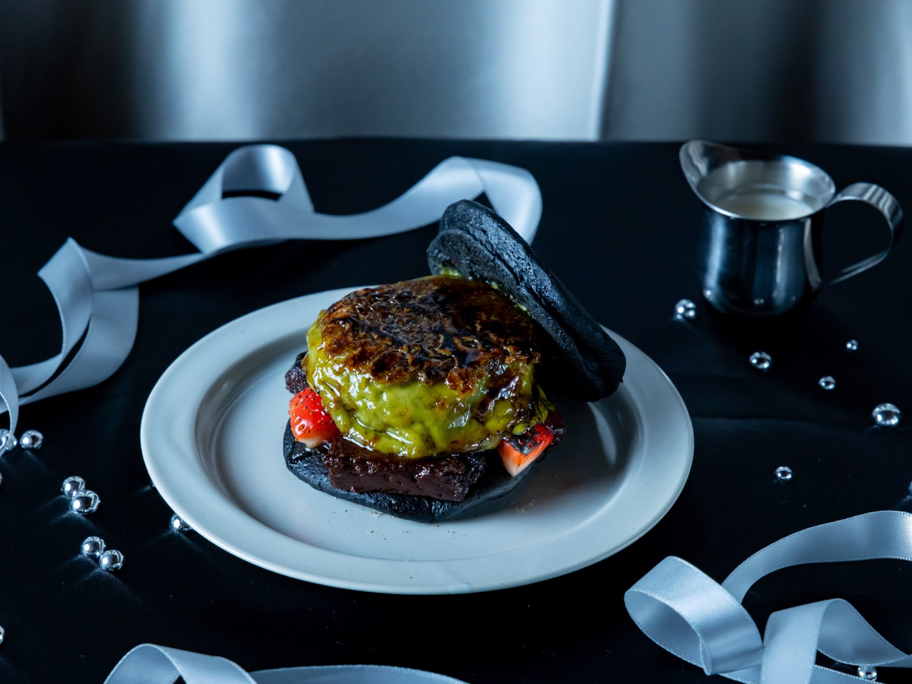 しっとりとした竹炭入りのブラックどら焼きの皮に、福岡県産あまおう、濃厚な生チョコ、抹茶の求肥、あんこホイップ、ベリーソース、そして八女抹茶のブリュレを重ねました。甘さ控えめのホワイトチョコソースは、あとがけで自由にお楽しみいただけます。甘味と苦味、和と洋が織りなす贅沢な味わいをご堪能ください。
