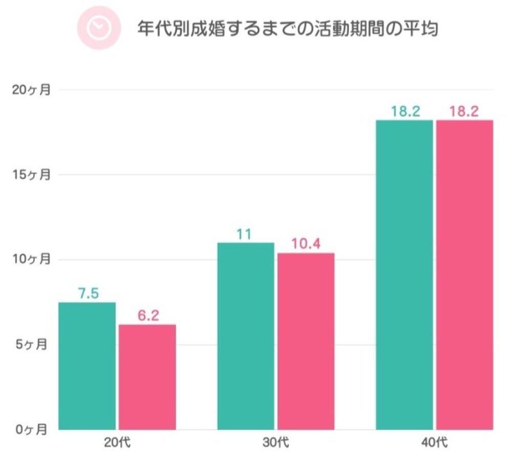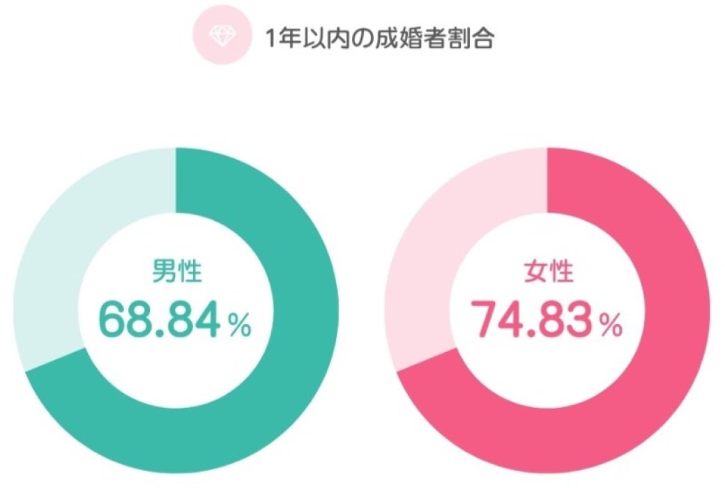 とら婚内で成婚に至るまでの活動期間は、中央値が男性会員様は約8カ月、女性会員様は約7カ月、年代別では20代は男性会員様7.5カ月、女性会員様6.2カ月、30代では男性会員様11カ月、女性会員様10.4カ月、40代は男性会員様、女性会員様とも18.2カ月掛かっているものの、とら婚全体では男性会員様の69%、女性会員様の75%が 【1年以内に成婚】 しています。