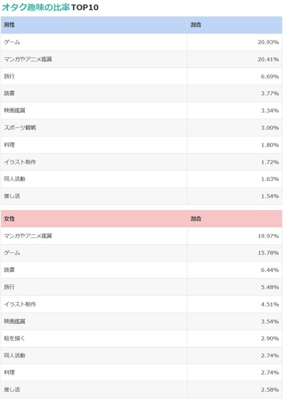 男女共通して、マンガやアニメ鑑賞・ゲームが主流であることがわかります。そのため、とら婚会員様同士でマッチングが成立した場合、共通の話題を持ちやすく関係構築を有利に進めることができると考えられます。