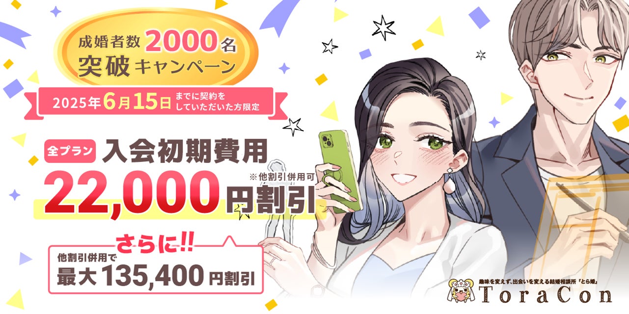 アニメや漫画・ゲームなど趣味をこよなく愛するオタク層向けに特化した結婚相談サービスとら婚(以下、とら婚)は、2025年5月にとら婚会員の成婚者数が2,000名を突破しました。これを記念し、そのまとめ情報の公開と、記念キャンペーンおよび記念イベントの開催決定をお知らせいたします。