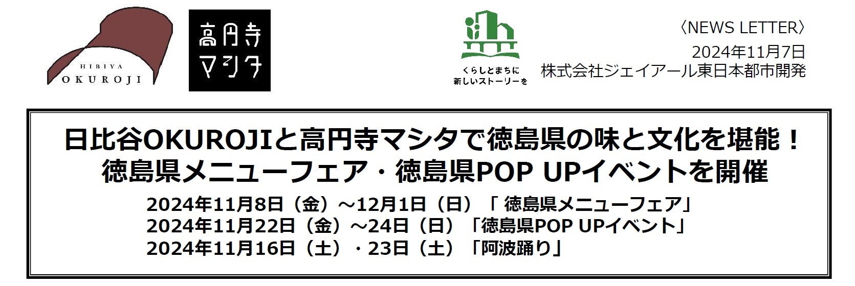 株式会社ジェイアール東日本都市開発は、日比谷OKUROJIと高円寺マシタにて、徳島県の特産食材を用いた「徳島県メニューフェア」と、徳島の魅力を体験できる「徳島県POP UPイベント」を開催いたします。この期間限定のイベントでは、徳島の味覚と文化を楽しんでいただける内容を用意しております。