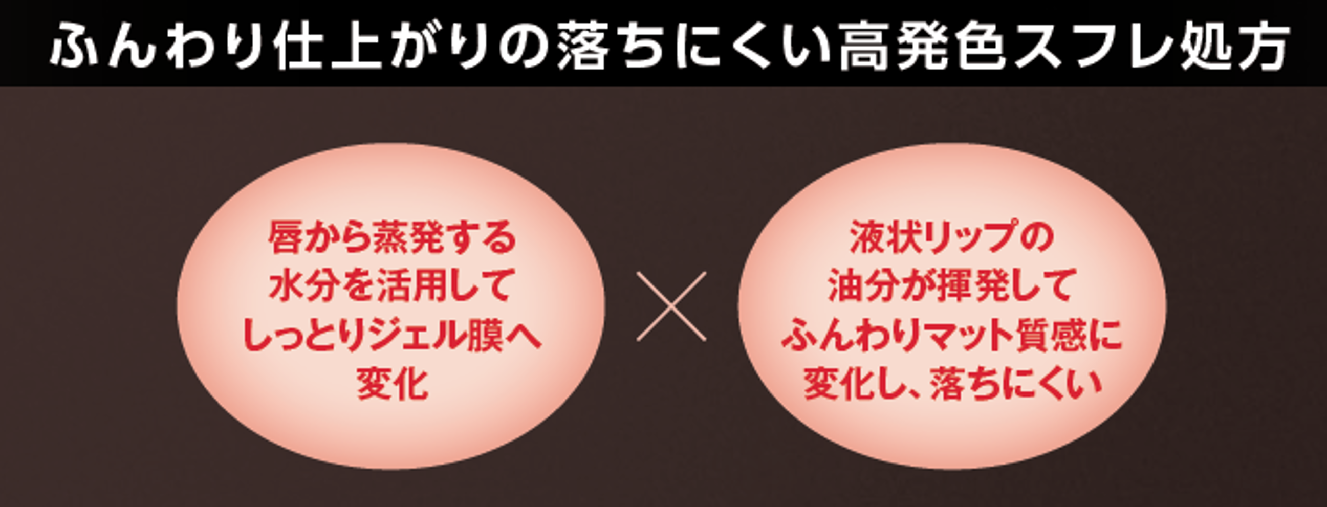 “高発色スフレ処方“は、唇から蒸発する水分を活用してしっとりジェル膜に変化する技術と液状リップの油分が揮発することでふんわりマット質感に変化し落ちにくさを実現する2つの技術からなる新処方です。