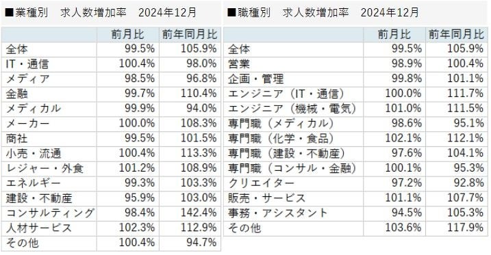 2024年12月の転職求人倍率は、前月から+0.33ポイントの3.15倍となりました。求人数は前月比99.5%、前年同月比105.9%となりました。転職希望者数は前月比89.0%、前年同月比108.4%でした。