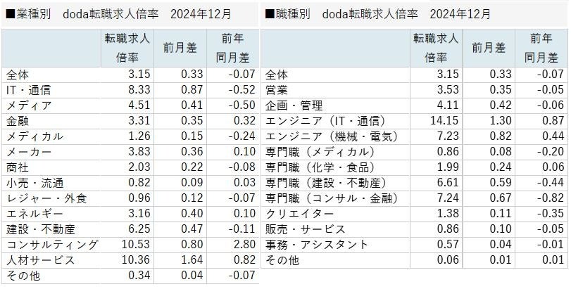 doda転職求人倍率2024年12月は3.15倍(前月差+0.33ポイント)