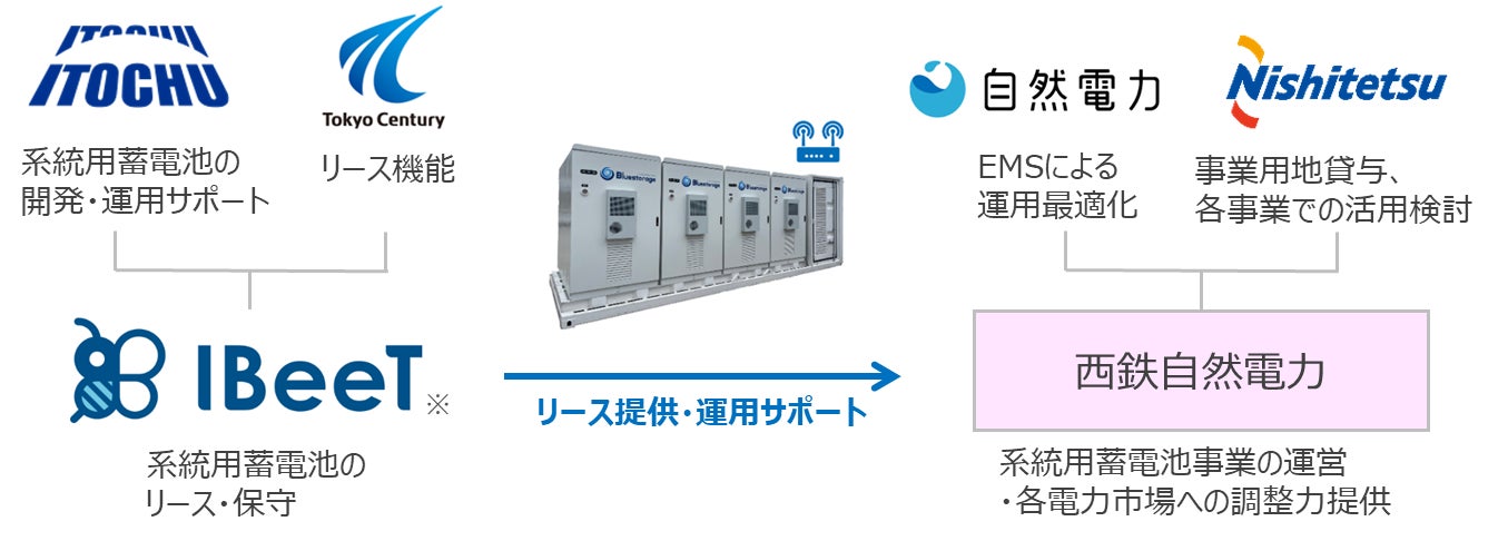 本事業における第1弾の取り組みとして、定格容量1.92MW/4.659MWhの系統用蓄電池を西鉄グループの施設2ヵ所に設置し、運用ノウハウの蓄積を図ります。蓄電池には伊藤忠商事株式会社が開発するEV向け高密度バッテリーを活用した蓄電システム「Bluestorage」(※2)を採用し、蓄電池のリースサービスを提供する株式会社IBeeTから西鉄自然電力がリースを受けて運用いたします。