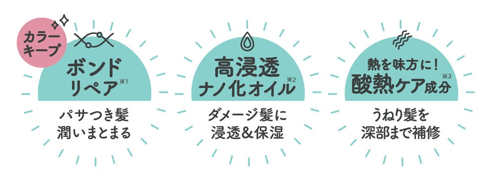 *1 髪表面を補修して整える *2 ラウロイルグルタミン酸ジ(フィトステリル/オクチルドデシル)、アルガニアスピノサ核油 、スクレロカリアビレア種子油 (全て保湿成分)*3 レブリン酸、マレイン酸(全て補修成分)