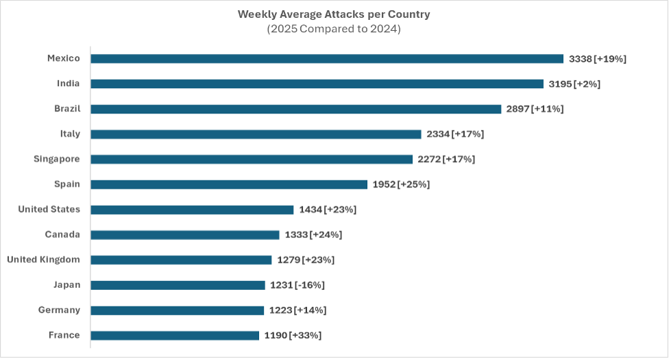 サイバー攻撃の手法と構造の変化におけるサイバーセキュリティ業界の主要な傾向を明らかに 日本は2024年比16%減となる週平均1231件の攻撃を受け上位12カ国中10位