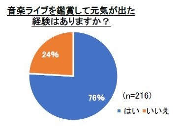 調査対象者に、音楽ライブを鑑賞して元気が出た経験はあるか聞いたところ、全体の76%が「はい」と回答しました。その理由として、「音楽やダンス、照明や演出など没頭できる」「みんなで一体感を楽しめる」などがあげられました。
