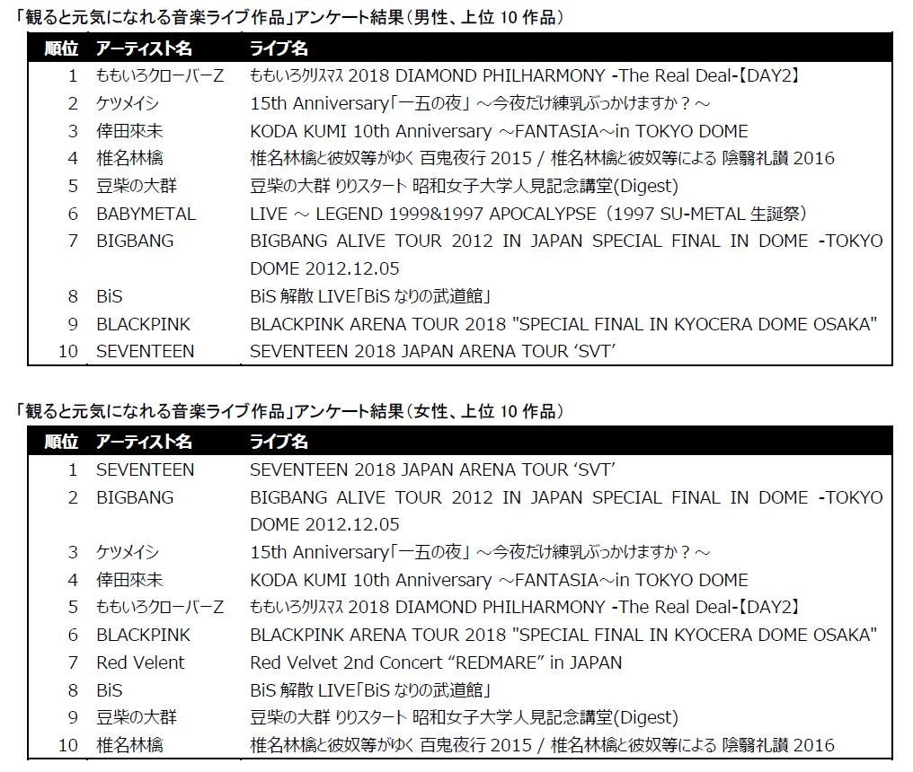 ■ 「元気になれるライブ作品」の男性第1位は、「ももいろクリスマス」(ももいろクローバーZ)、 女性第1位は「SEVENTEEN 2018 JAPAN ARENA TOUR」(SEVENTEEN)