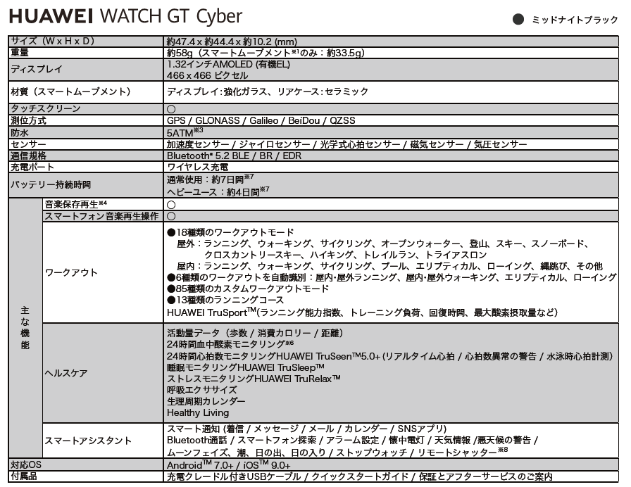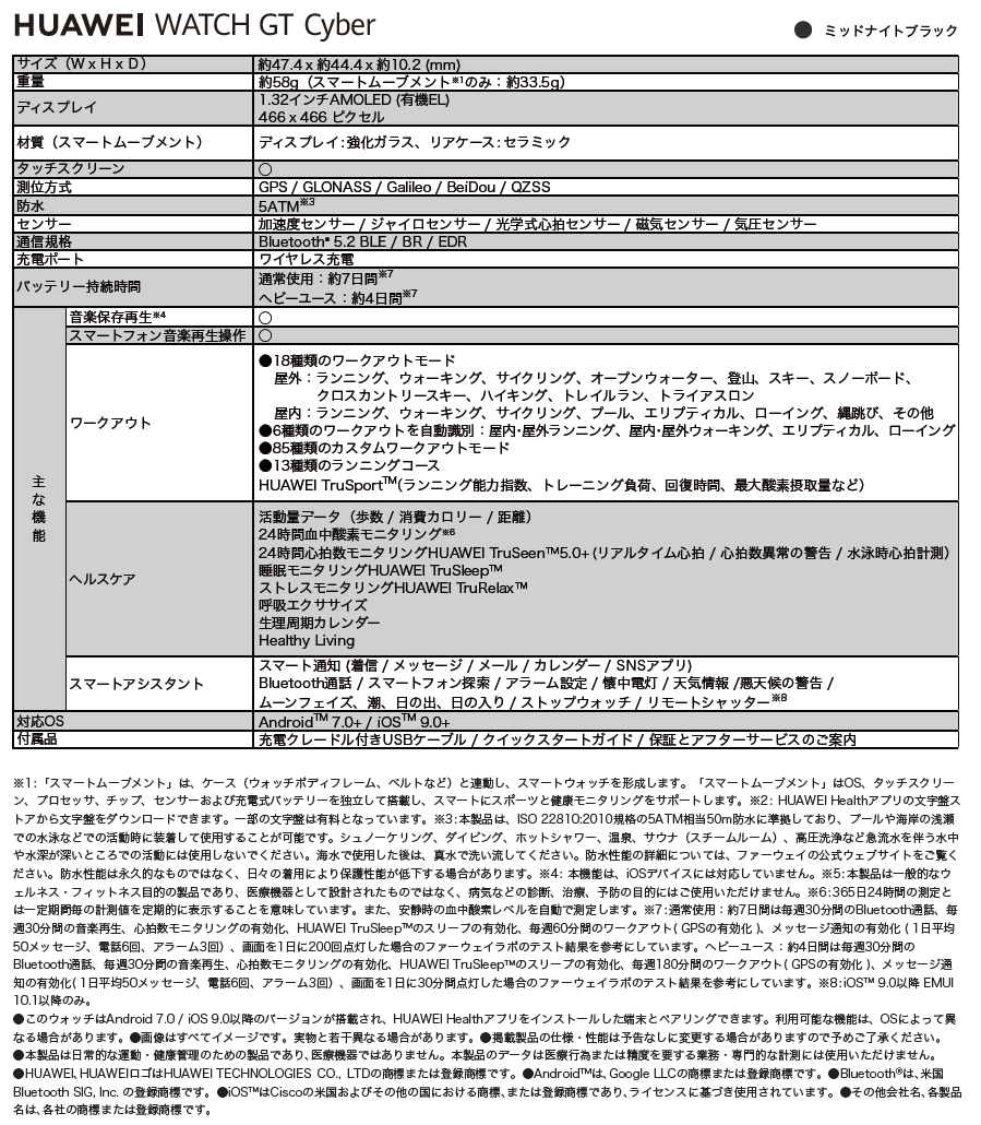 『HUAWEI WATCH GT Cyber』の主な仕様