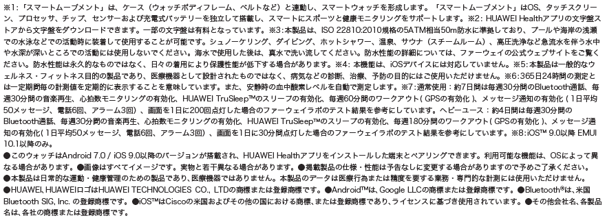 ※4:通常使用で約7日間は、毎週30分間のBluetooth通話、毎週30分間の音楽再生、心拍数モニタリングの有効化、HUAWEI TruSleepTMのスリープの有効化、毎週60分間のワークアウト( GPSの有効化 )、メッセージ通知の有効化 ( 1日平均50メッセージ、電話6回、アラーム3回)、画面を1日に200回点灯した場合のファーウェイラボのテスト結果を参考にしています。