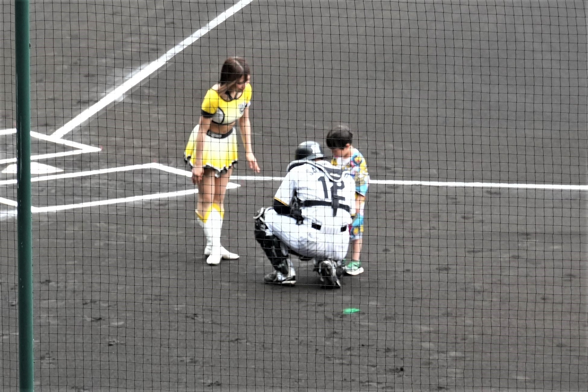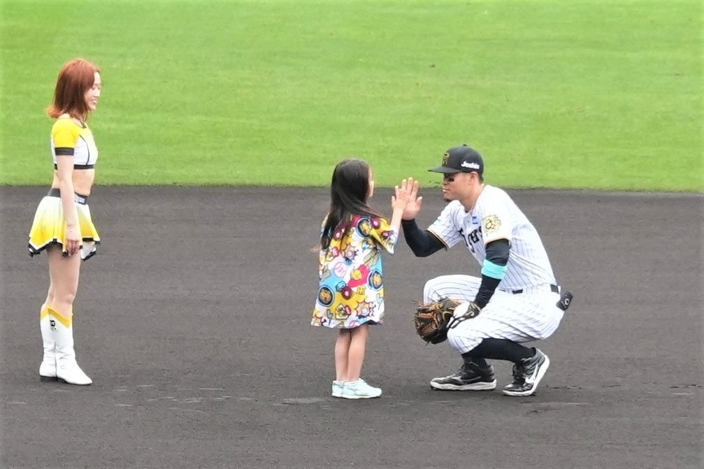 本キャンペーンで当選した8名の子供たちには、阪神タイガースより提供いただいた「KIDSユニフォ ーム」を着て、試合開始前のグラウンドの各ポジションでスターティングメンバ―の選手を迎えました。