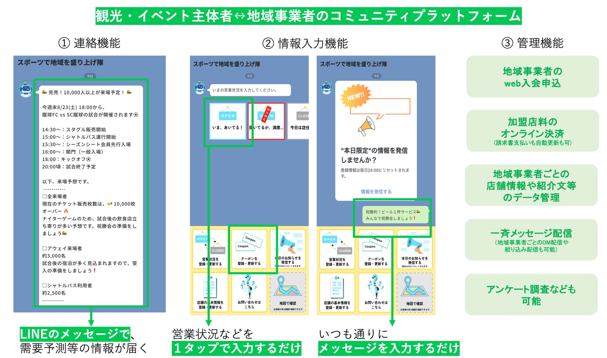 地域事業者はLINE経由でイベント来訪予測等の需要が共有され、営業状況やクーポンのリアルタイム発信も可能に