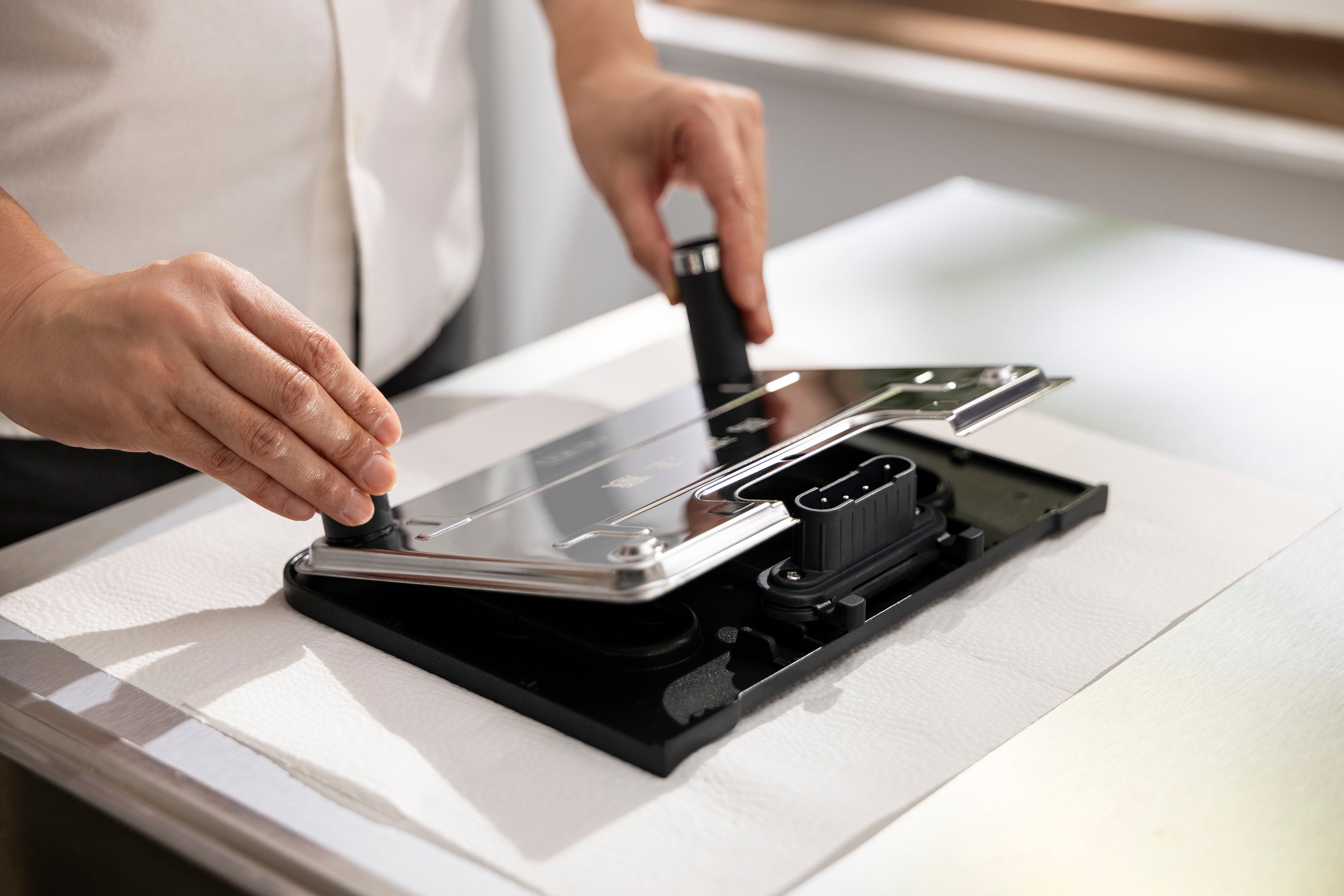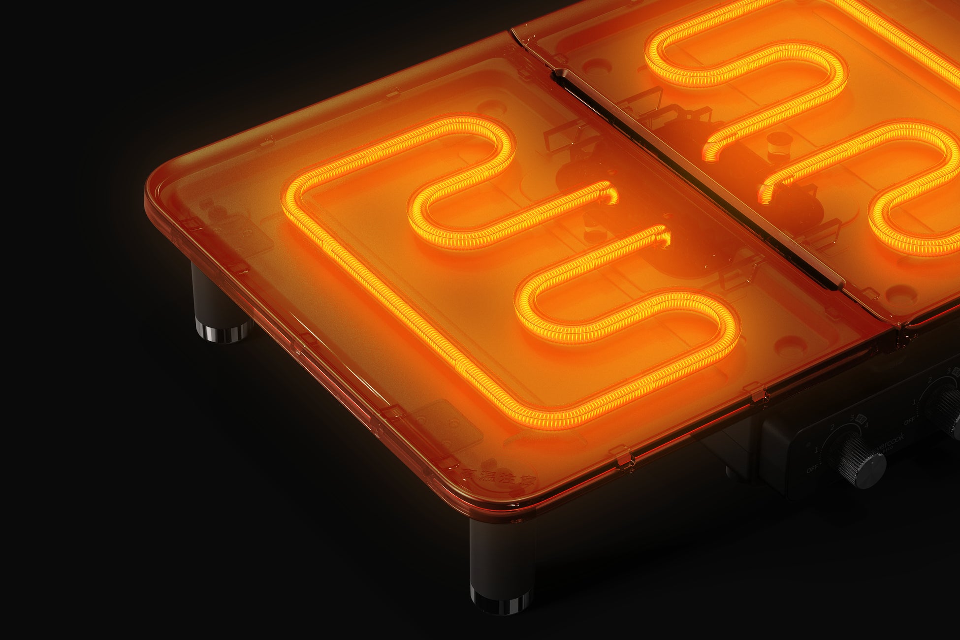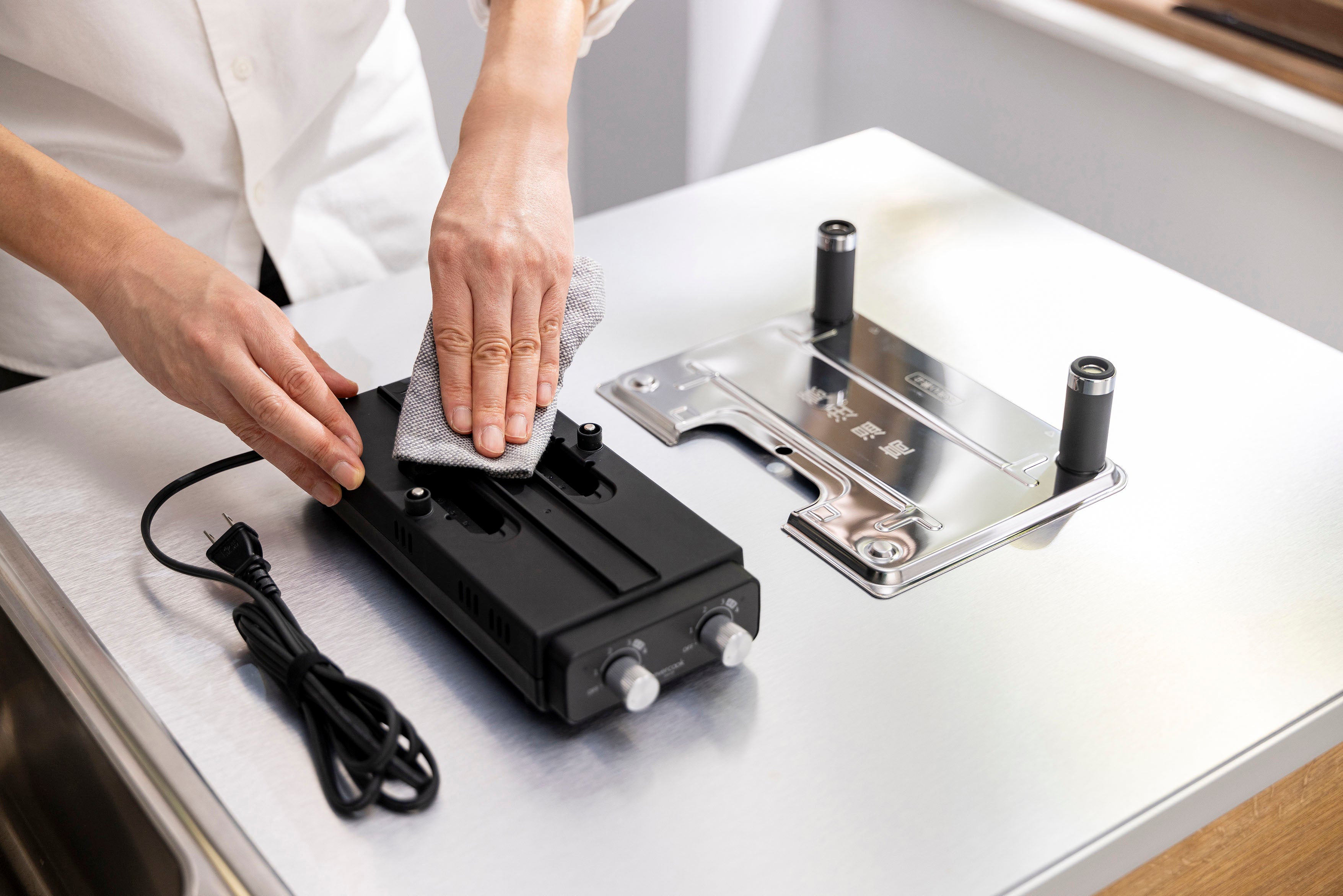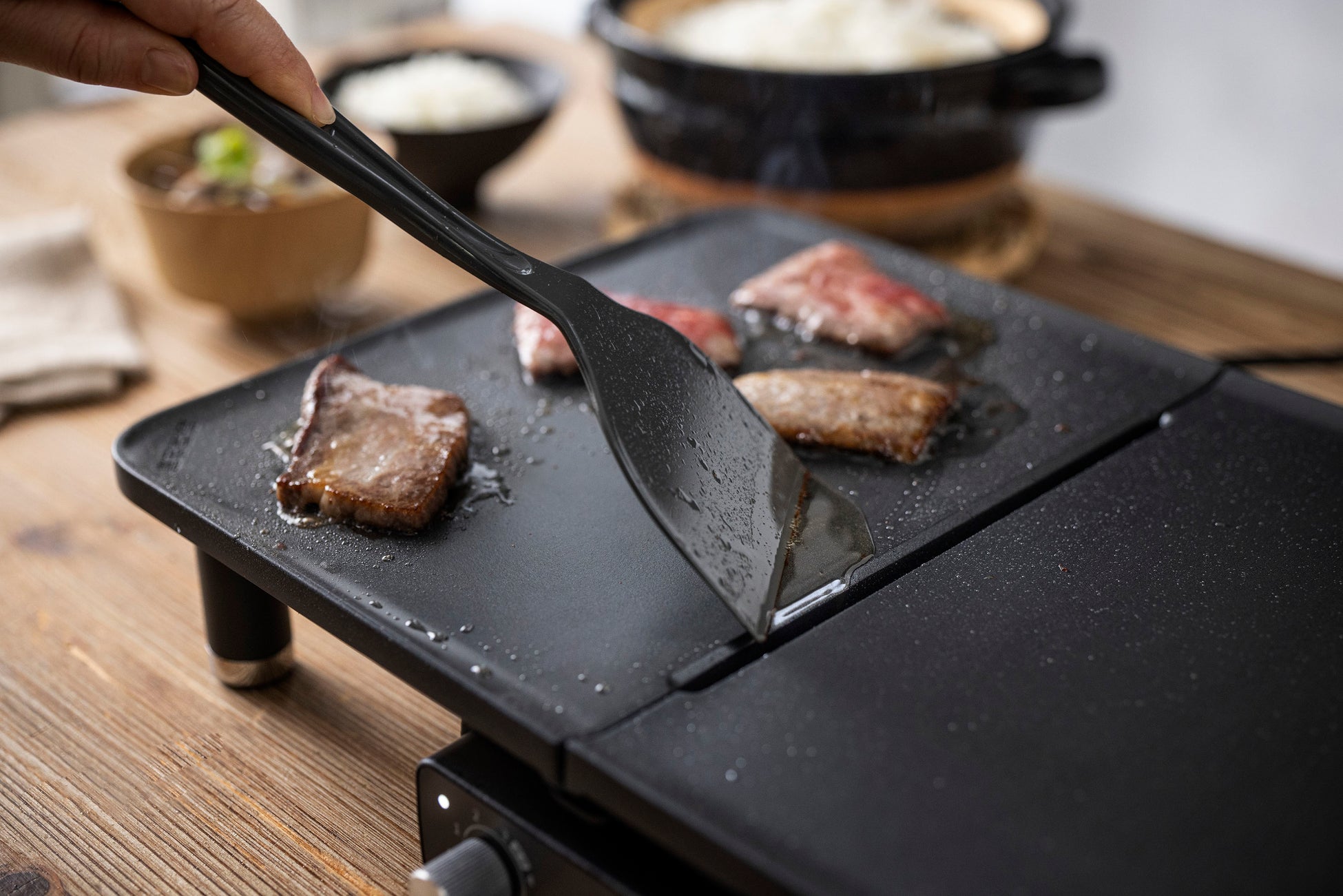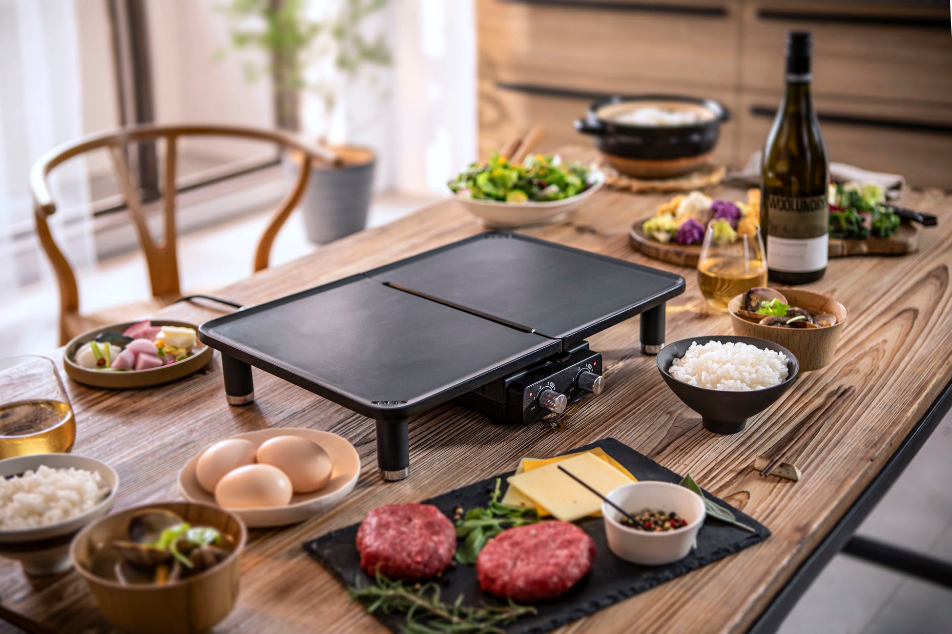 電源コードは、一般的なホットプレートで使用されるような着脱プラグではなくスリムなプラグを採用することで、家電らしさ、メカらしさを排除。レストランでハンバーグ等が提供されるグリルプレートのように、食卓を盛り上げてくれる調理器具に仕上げました。