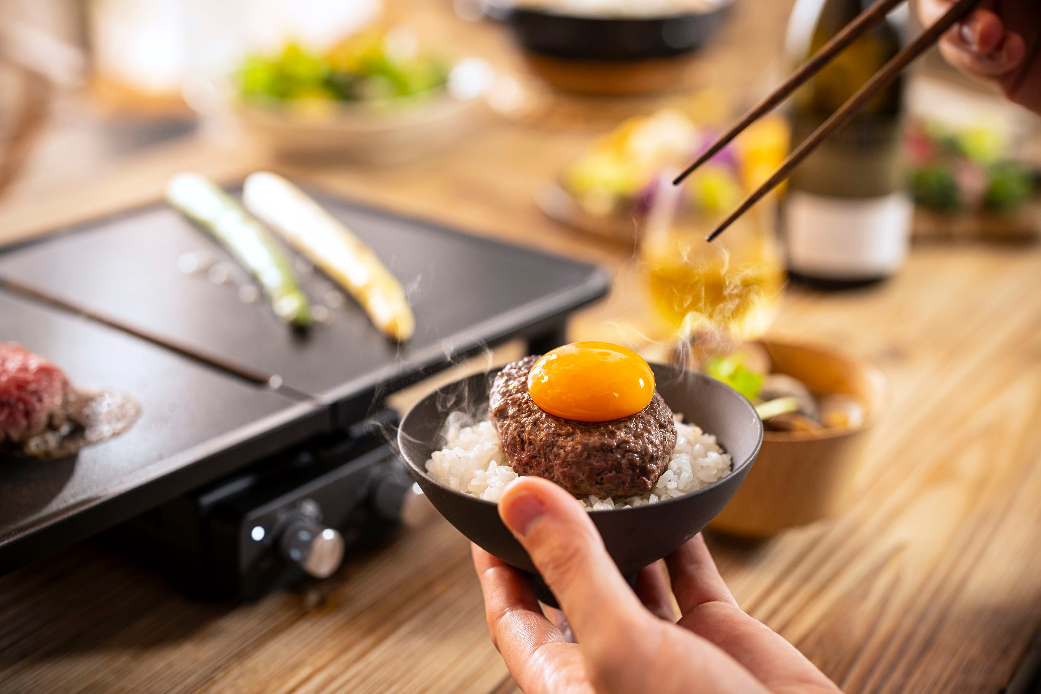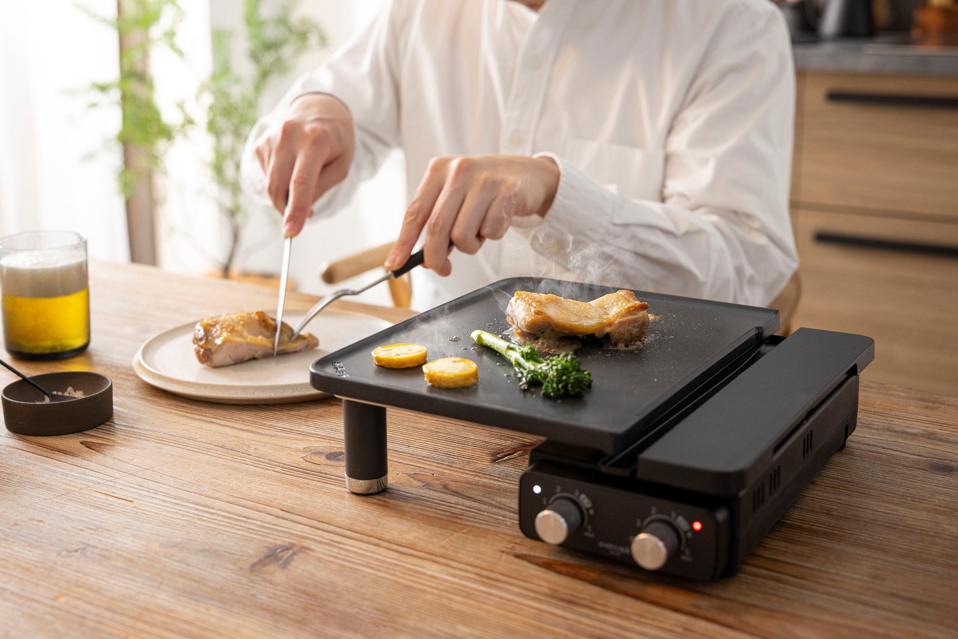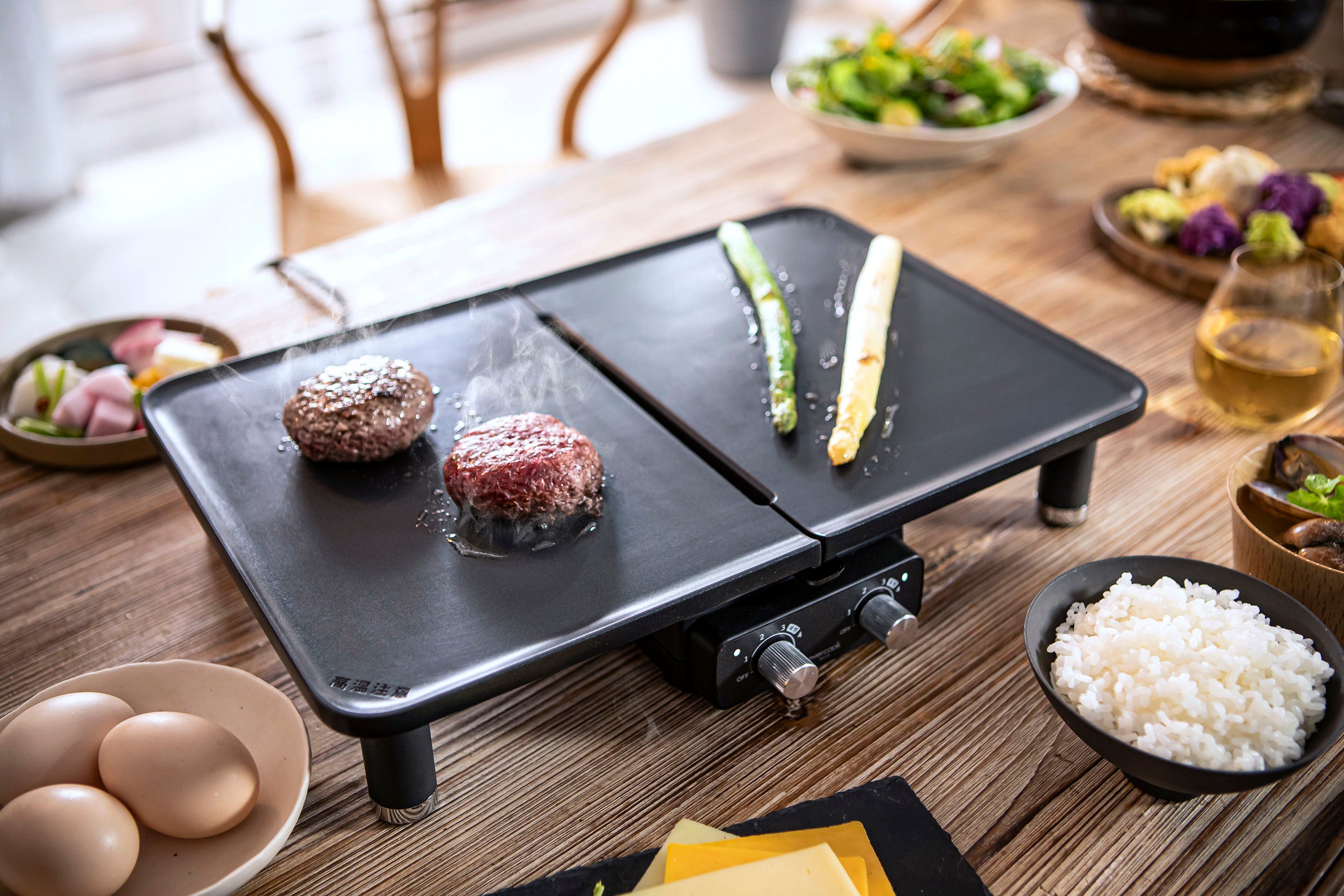 本製品では、 それぞれ火加減を調整できる2枚のプレートが特長です。食材に合わせた焼き加減を調整することができます。片面で焼肉を高温で焼き、野菜はじっくりと低温で焼くこと等が可能です。