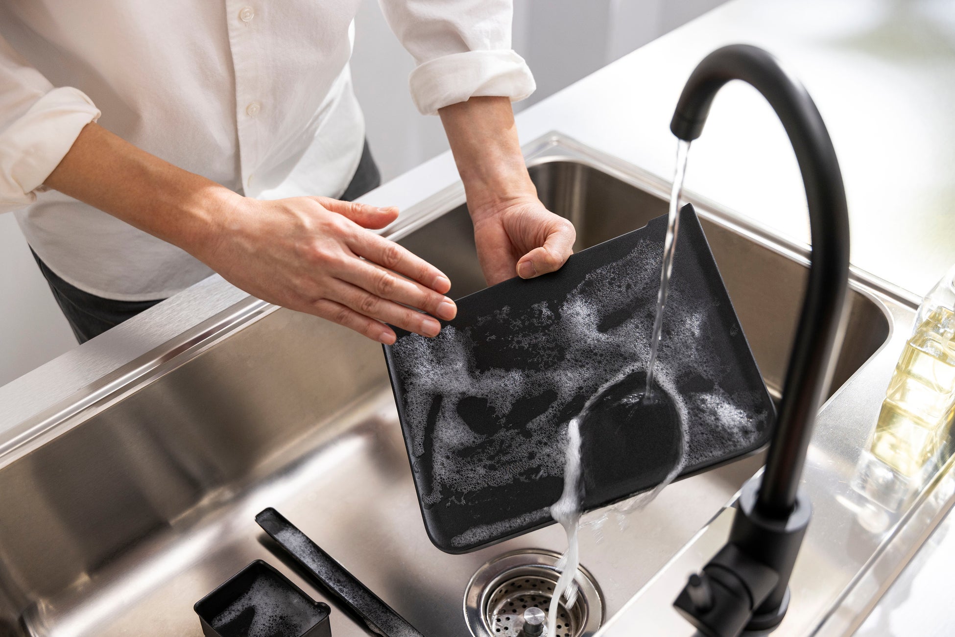 毎日使ってほしいと考え、お手入れのしやすさにもこだわりました。スリットを通じてたまった油、プレート部分は取りはずせるので、丸洗いが可能です。
