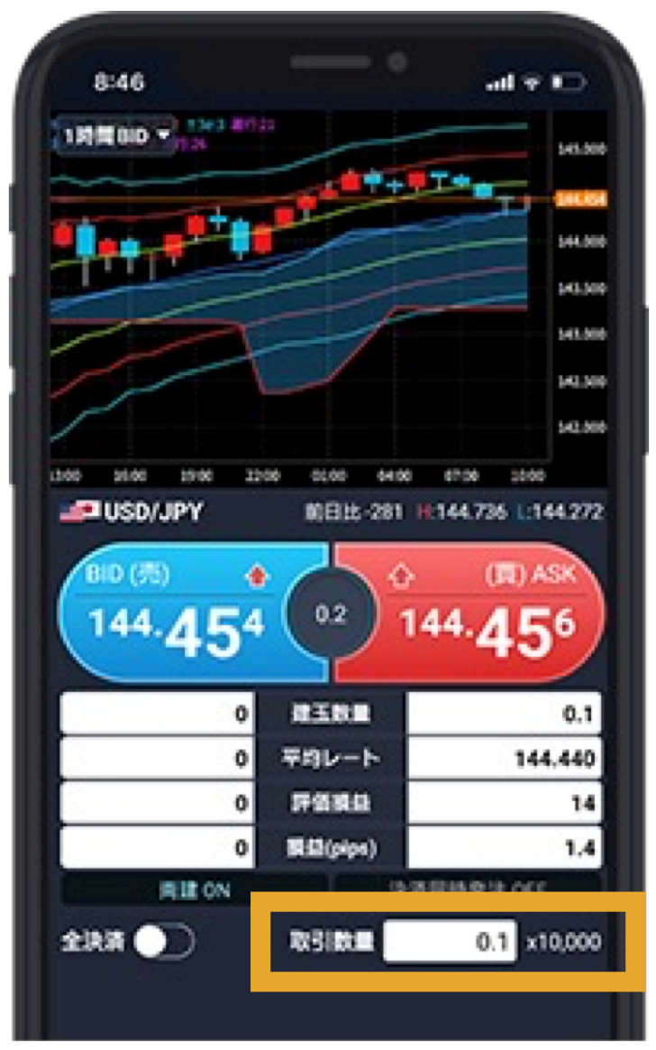 1,000通貨単位での取引も、取引数量を0.1と指定するだけでスムーズなお取引が可能です。デモ取引は、口座開設がお済みでないお客様もアプリをインストールするだけで、登録不要・無料でご利用いただけます。ぜひ、この機会にお試しください。