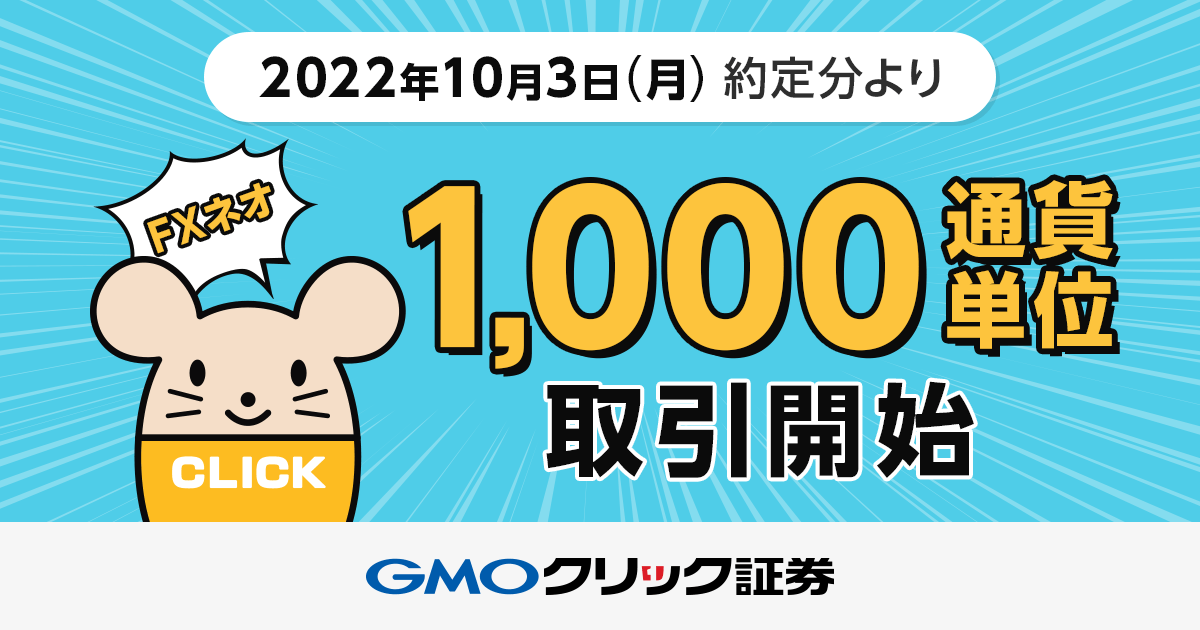GMOインターネットグループのGMOフィナンシャルホールディングス株式会社の連結会社で、金融商品取引業を営むGMOクリック証券株式会社(本社:東京都渋谷区、代表取締役社長:鬼頭 弘泰、以下:当社)は、2022年10月3日(月)約定分より、店頭FX取引サービス「FXネオ」の最小取引単位を1,000通貨単位(※)に引き下げましたので、お知らせいたします。