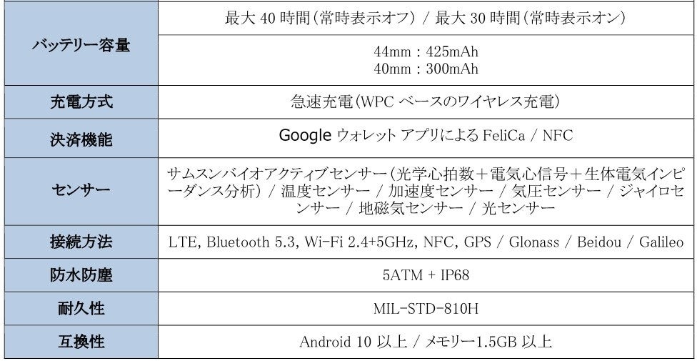 ※2 実際の使用時間は、使用されるネットワーク環境、使用パターン、その他の要因によって異なる場合があります。 テストはSamsungが「Galaxy Watch6」のプレリリース版(BTおよびLTE)を使用し、それぞれGalaxy スマートフォンとペアリングして実施したものです。デバイスはすべて、プレリリースのソフトウェア、Galaxy Watch Magnetic Fast Charging USB C Cable(EP-OR900)、Samsung 25W USB C Power Adapter(EP-TA800)でテストしています。地域、設定、使用パターン、使用環境などによって異なる場合があります。