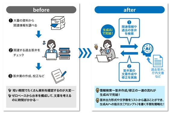 そこで、次のステップとして、生成AIの特性を理解し、適切かつ効率的な活用ができるようにするため、以下の①、②を目的として本業務を実施しました。