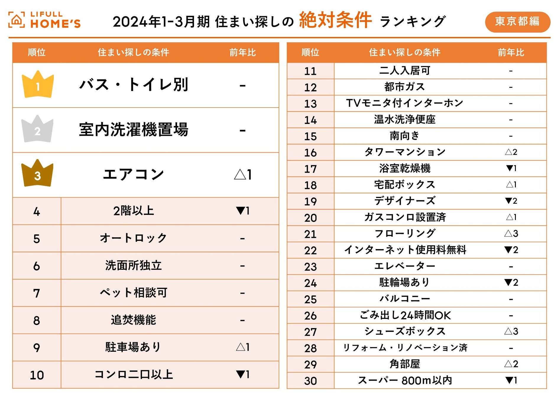 2024年1-3月期に、東京都内の住まい探しで必須選択された「絶対条件」ランキングの1位は「バス・トイレ別」、2位は「室内洗濯機置場」、3位は「エアコン」となりました。前年と比較すると「エアコン」と「2階以上」の順位が逆転し、首都圏すべてでTOP3が同じ条件となりました。