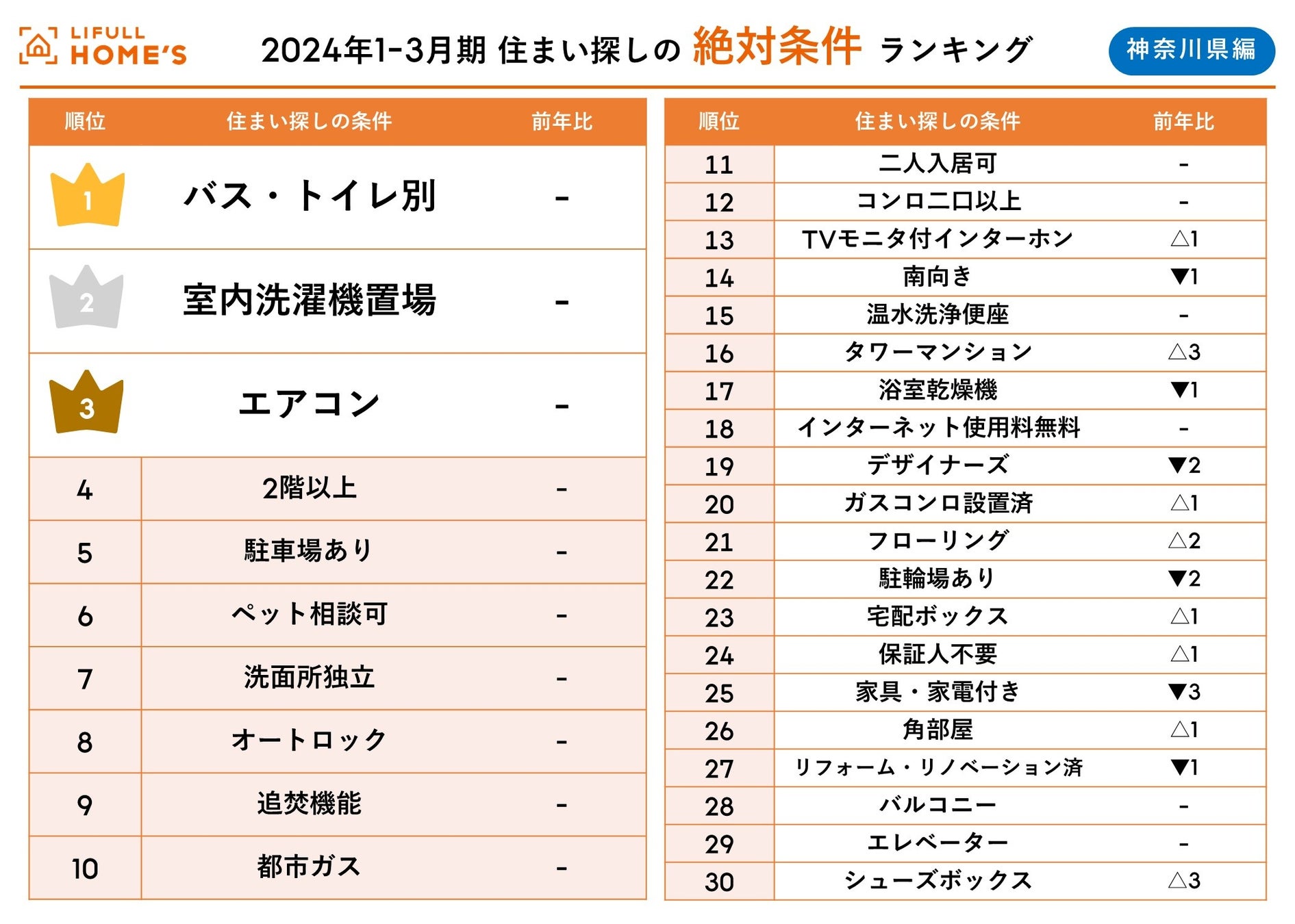 2024年1-3月期に、神奈川県内の住まい探しで必須選択された「絶対条件」ランキングの1位は「バス・トイレ別」、2位は「室内洗濯機置場」、3位は「エアコン」となりました。TOP10は前年の結果と全く同じで、これは首都圏で神奈川県のみです。
