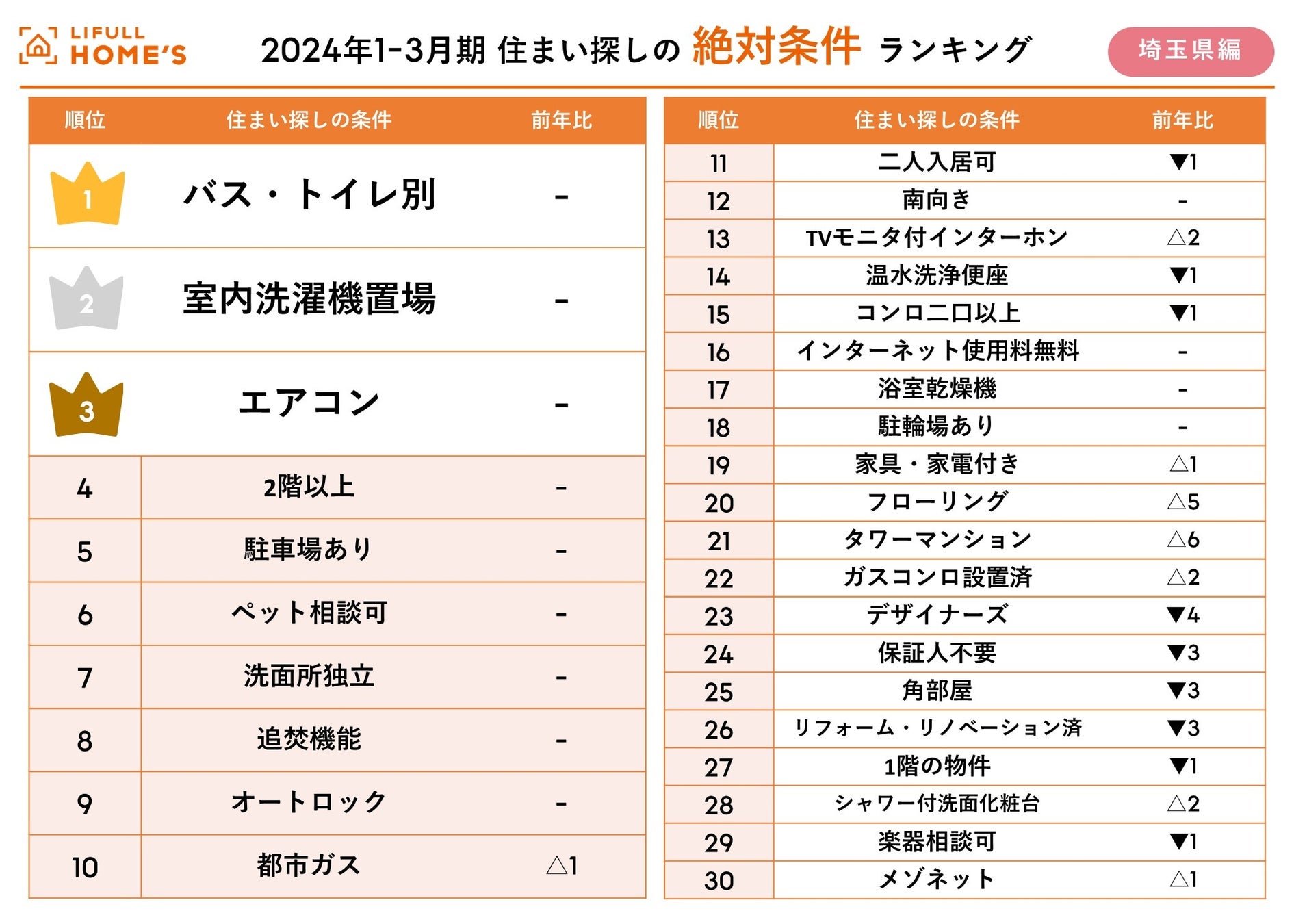 2024年1-3月期 住まい探しの絶対条件ランキング【埼玉県編】