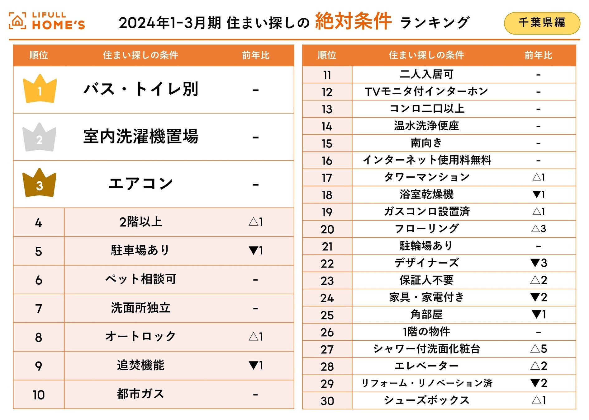 2024年1-3月期に、千葉県内の住まい探しで必須選択された「絶対条件」ランキングの1位は「バス・トイレ別」、2位は「室内洗濯機置場」、3位は「エアコン」となりました。「2階以上」と「駐車場あり」が、「オートロック」と「追焚機能」が前年と順位が入れ替わりました。