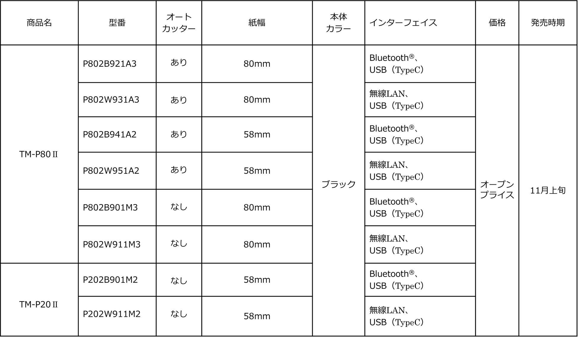また、『TM-P80Ⅱ』は紙幅、カット方式(オートカッター/マニュアルカット)、インターフェイスによって6種類のモデルをご用意していますので、ニーズに合わせて選択することが可能です。