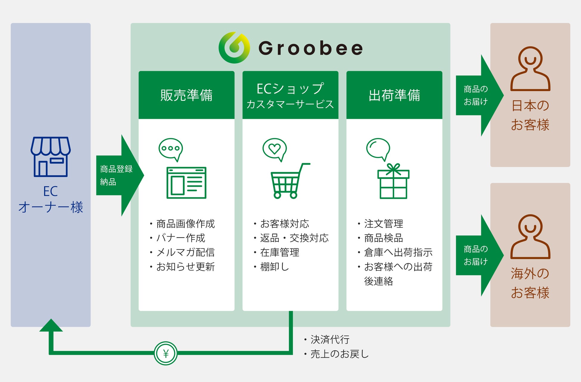 BEENOS Entertainmentは、BEENOSグループの「経験値」「ネットワーク」「データの蓄積」といった3つの強みと新たな「テクノロジー」を駆使し、エンターテインメント産業のデジタルトランスフォーメーション(DX)とグローバル化を支援する事業を行っております。運営するエンターテインメント特化型プラットフォーム「Groobee(https://groobee.com)」ではサイト構築から運営まで一気通貫でサポート、アーティスト・アニメやキャラクター等のコンテンツに特化しており、単独型からモール型でのECサイト展開まで対応が可能です。また、BEENOSグループの展開する越境販売支援サービス「Buyee Connect(バイイーコネクト)https://beecruise.co.jp/infra/buyeeconnect/」との連携もできるため世界118の国・地域のファンから商品の購入が可能になるなどエンターテインメントに最適な機能が詰まっています。