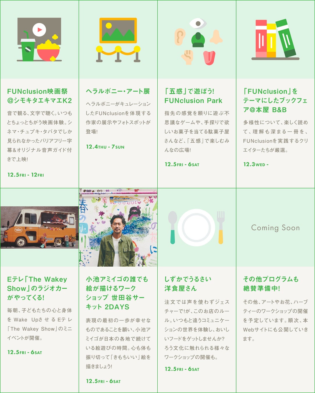 今回開催するイベントは、多様な文化が軽やかに混ざり合う街・下北沢を舞台に 、「FUNclusion 」を体験いただける数々のコンテンツを用意。どなたでも自由に参加することができ、アート展示、映画祭、トークイベント、ワークショップなどを通じて、多様な人々が互いの違いを尊重し、自然と混ざり合う場をつくります。そして、「FUNclusion」な体験をきっかけに、一人ひとりの中にある“あたりまえ”が少し揺さぶられ、世界の見え方が広がっていく——。そんな瞬間が生まれることを願っています。