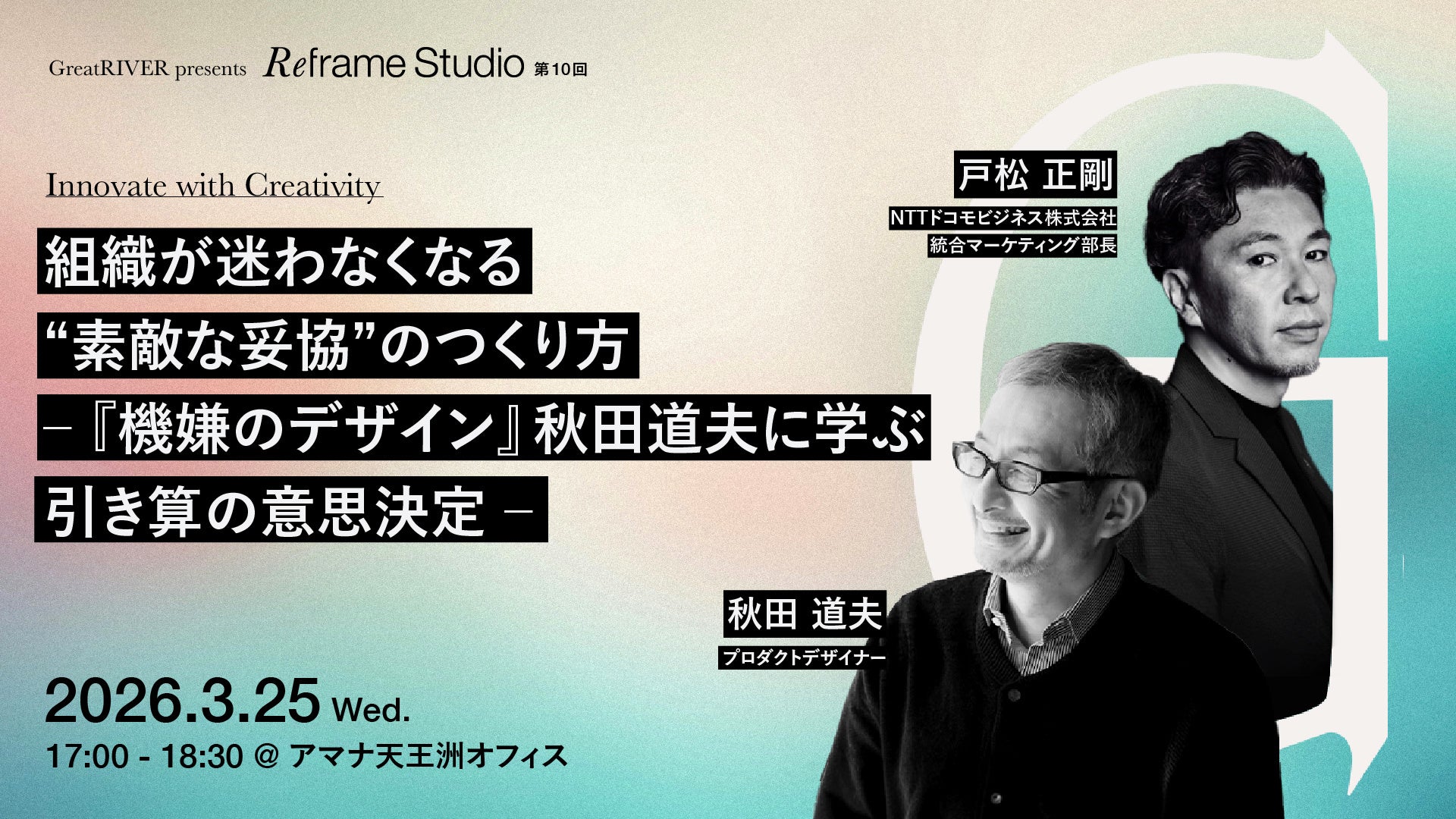 コミュニケーション変革をクリエイティブで実現する株式会社アマナ(本社:東京都品川区、代表取締役社長:金子剛章、以下「アマナ」)は、2026年3月25日(水)、「組織が迷わなくなる“素敵な妥協”のつくり方 ─『機嫌のデザイン』秋田道夫に学ぶ引き算の意思決定 ─ Great RIVER presents〈Reframe Studio〉第10回」をテーマにセミナーを開催します。