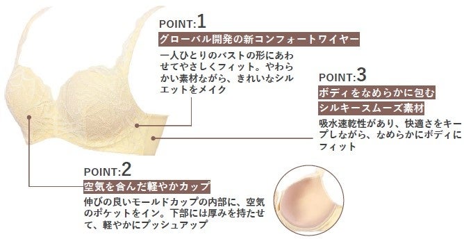 「ブラジャーはラクな着けごこちがいい」という世界的なトレンドを受け、グローバルで新開発したのは、独自の「コンフォートワイヤー」。“ワイヤー”と名前は付いていますが、従来の印象とはまったく異なるしなやかさで、一人ひとりのバストの形にあわせてやさしくフィット。また下部に厚みをもたせたカップ内部には空気のポケットが含まれており、軽やかなプッシュアップ感も自慢です。さらに、サイドや背部にはシルキースムース素材を採用。吸水速乾性があり、快適さをキープしながら、なめらかにボディを包み込みます。