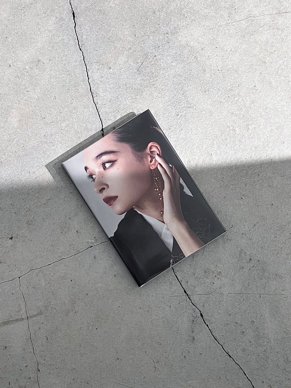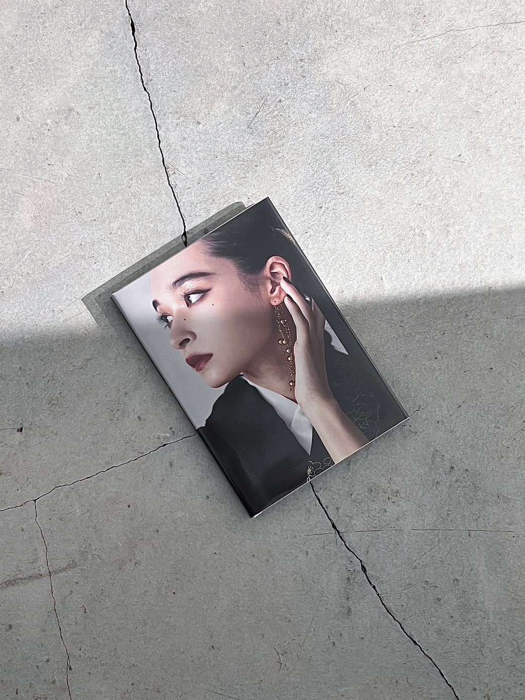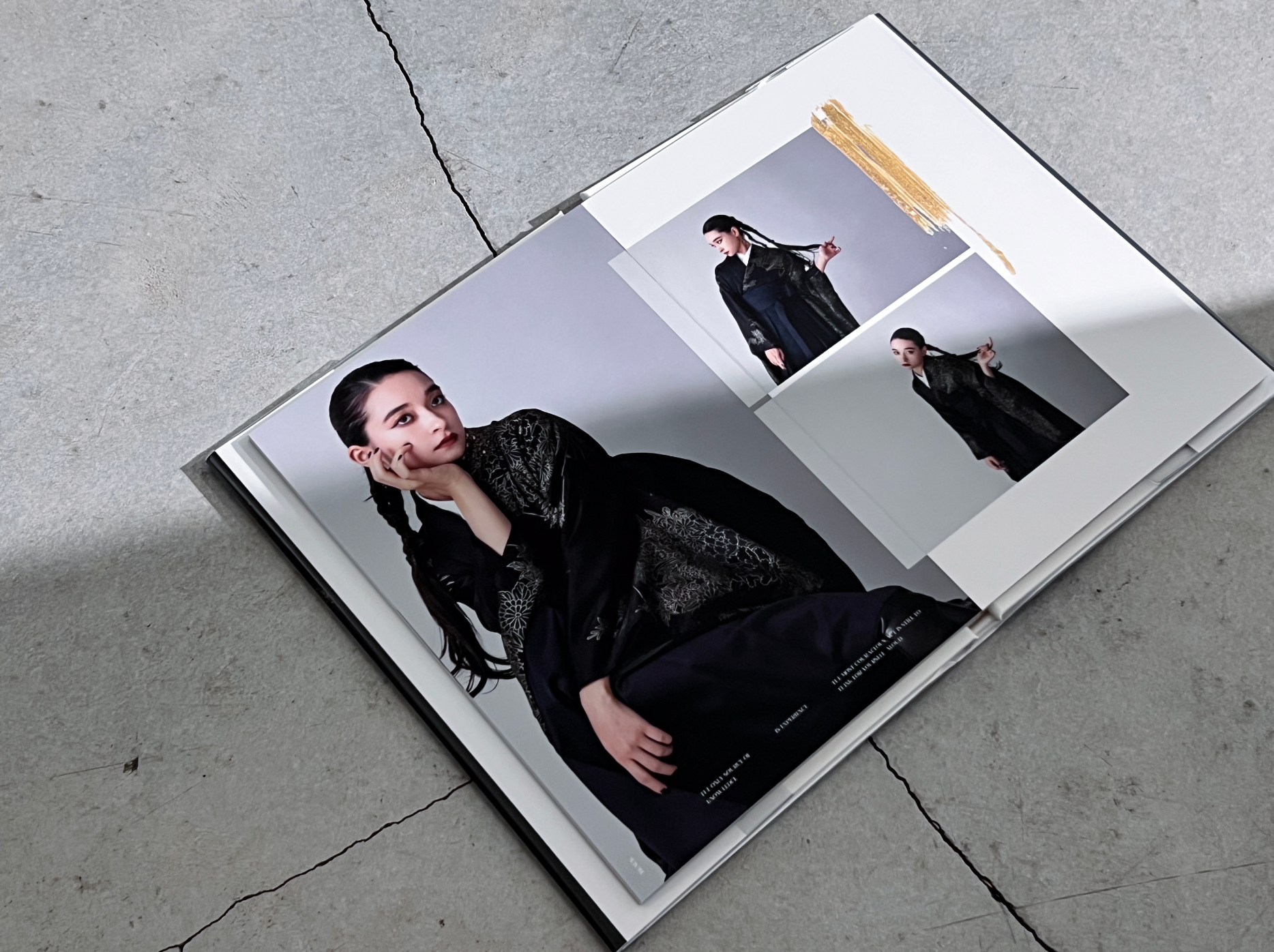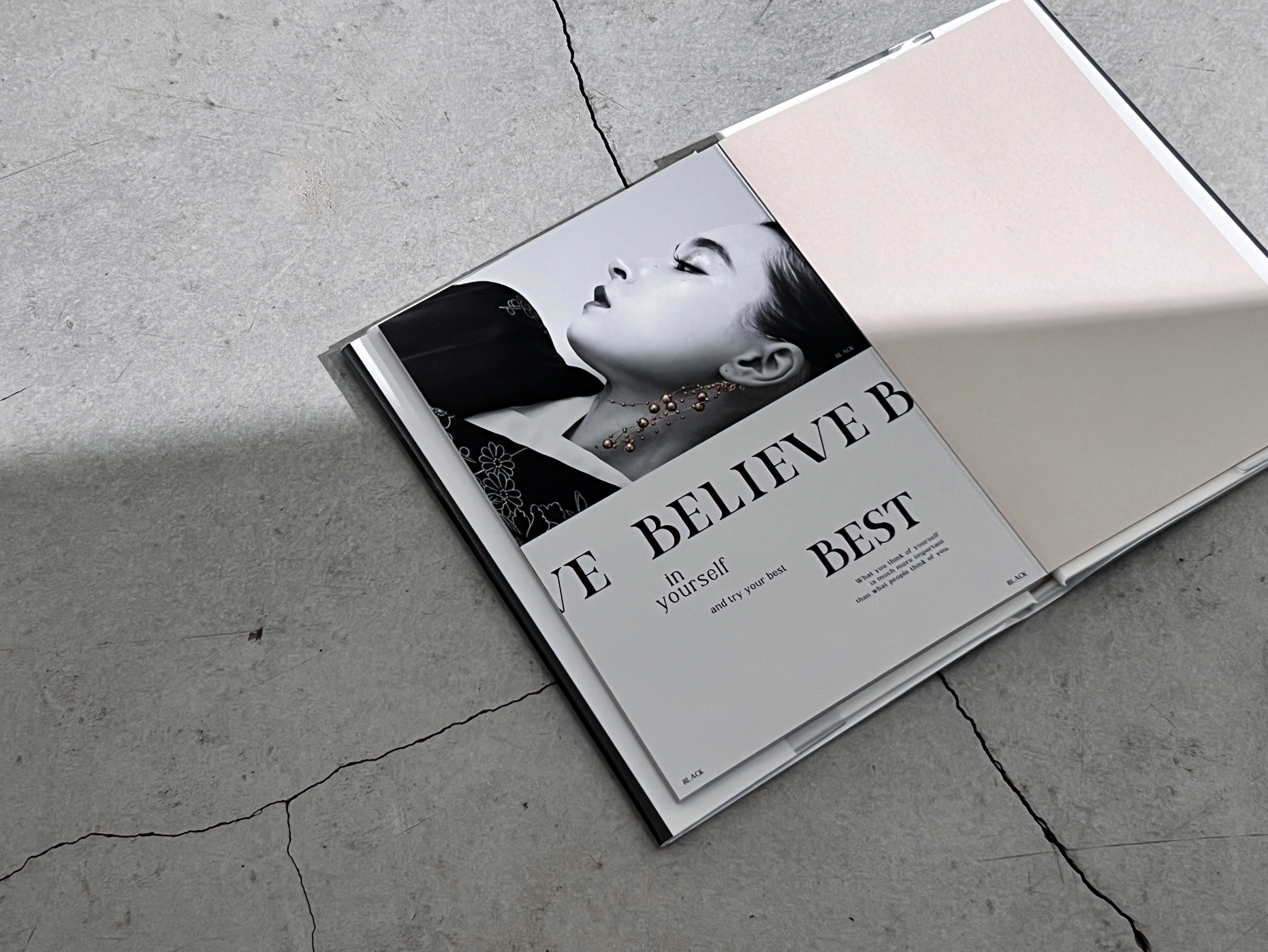 ガーリーなコーデと落ち着いた背景のシックな印象のあるビジュアルを生かし、美術館のパンフレットのような落ち着いた高級感のあるデザインをベースに、筆記体フォントやまるふちを使用しガーリーを感じる要素を散りばめた1冊。