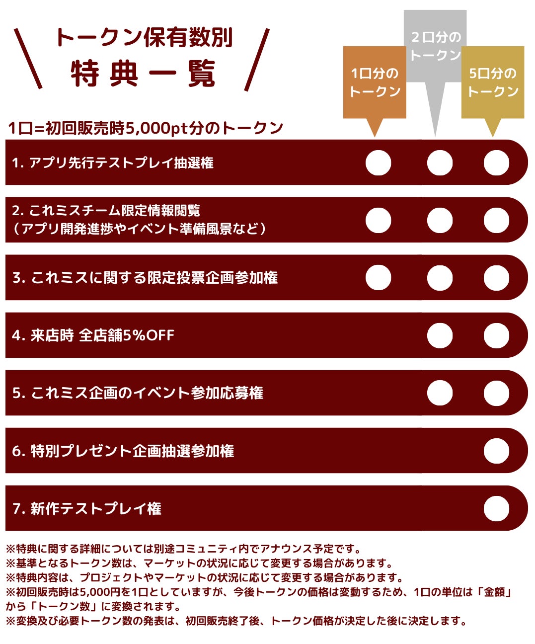支援者にはトークンが配布され、トークンを持ち続けることで「店舗5%OFF」や「これミスに関する限定投票企画参加権」など、様々な保有特典を得ることができます。