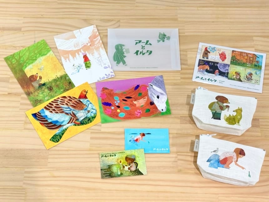 絵本の出版を記念して、本展オリジナルグッズをご用意しました。物語のテーマ「旅」にちなんだものは、福田さんとアンネさん、それぞれにユニークで印象的な色遣いが活きたすてきなアイテムに仕上がりました(ポストカードセット、ステッカー、切手風シール、fog linen work のミニポーチをご用意しています)。福田さんとアンネさんがすでに販売されている絵本やグッズもご用意する予定です。