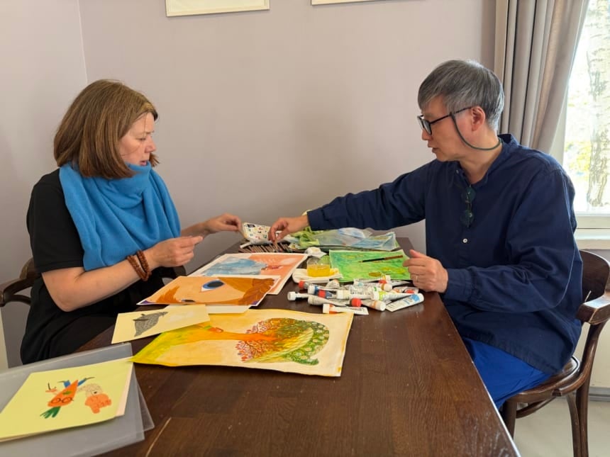 2010年、フィンランドで福田さんが個展をひらいたとき、翻訳家・森下圭子さんの紹介で福田さんとアンネさんが出会いました。その翌年2011年に、福田さんとアンネさんは日本で「2人展」をひらき、「2人展」を開催後に、「一緒に絵本を作ろう!」と約束したのでした。そこから15年、生活の変化やさまざまな体験を経て生まれた福田さんとアンネさんコラボレーションの絵本『アームとイルタ』が、いよいよ2026年3月に完成します。