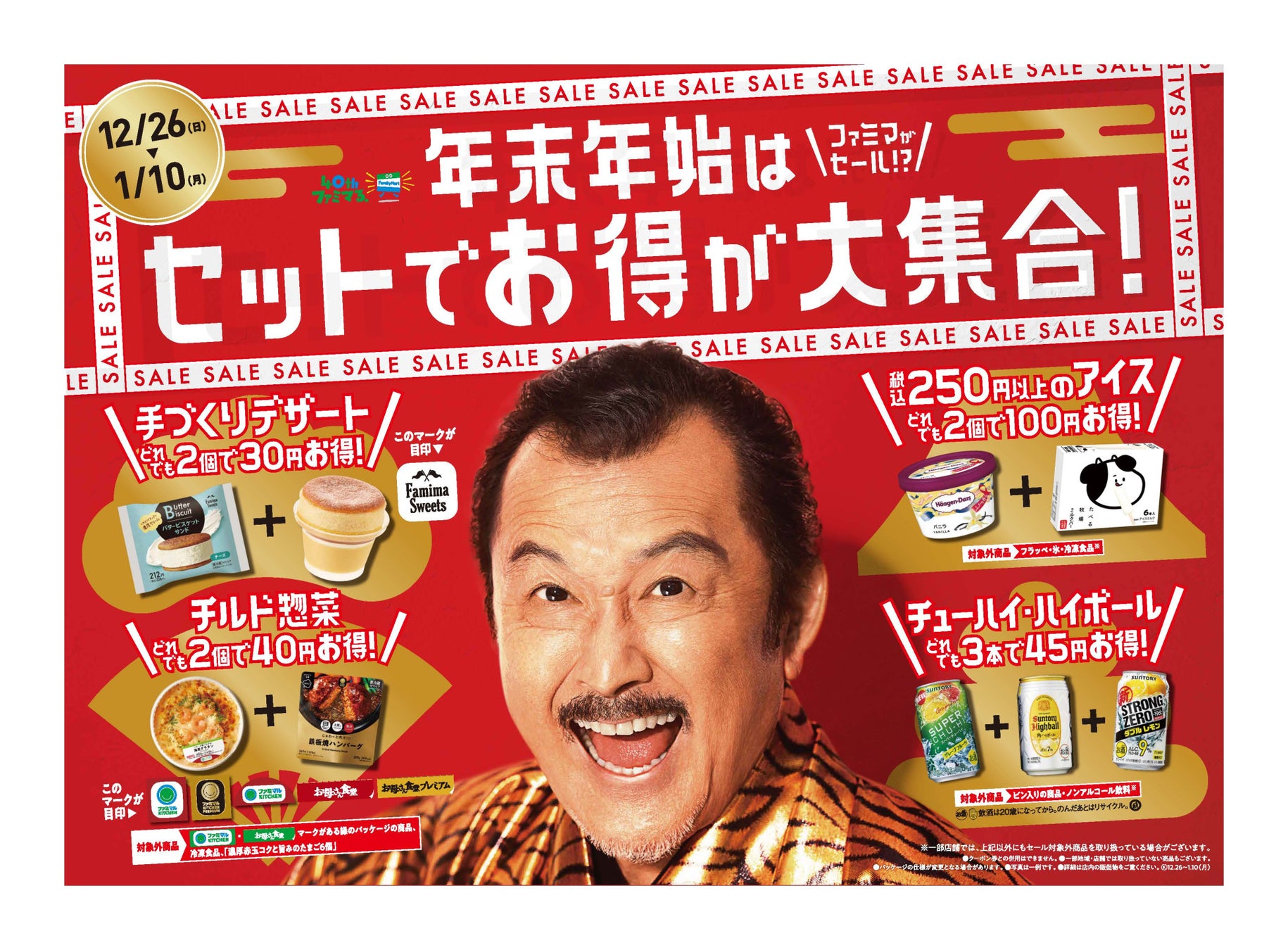 このたびは、「40のいいこと!?」の5つのキーワードの1つである「たのしいおトク」の一環として、2021年12月26日(日)から2022年1月10日(月)まで、全国のファミリーマート約16,600店で、「年末年始はセットでお得が大集合!ファミマがセール!?」と題し、大型割引キャンペーンを実施しております。こちらは、2021年のゴールデンウィーク期間中に実施した「ファミマがセール!?」の第2弾で、年末年始の期間中に様々な割引を実施し、皆さまにお買い物を楽しんでいただけるキャンペーンとなっております。