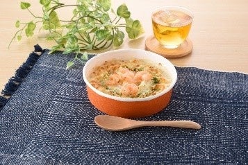 【内容】バターとバター風味オイルを使用し、レンジアップした際に「バターの香り」がふわっと広がります。2種類のチーズ(チェダー・モザレラ)とぷりぷり食感の海老を5尾載せて、香ばしく焼き上げました。