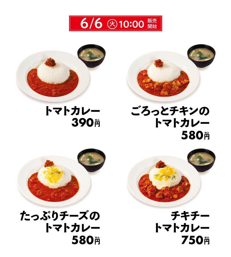 商品名 トマトカレー※チキン等が入らないプレーンでのご提供 390円 ごろっとチキンのトマトカレー 580円 たっぷりチーズのトマトカレー 580円 チキチートマトカレー 750円 ※お持ち帰りいただけます。お持ち帰りにみそ汁は付きません。 お持ち帰りの場合、みそ汁は別途60円でお求めいただけます。 ※税込み価格です。 発売日 2023年6月6日(火)午前10時 ~ 対象店舗 一部店舗を除く全国の松屋 |