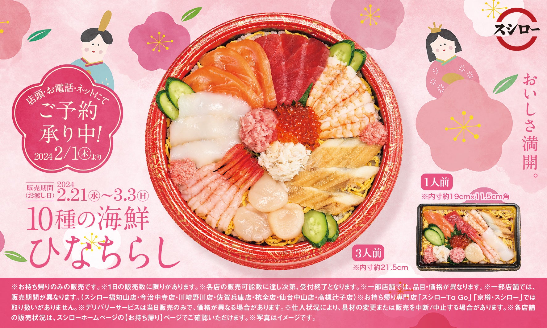 毎年ご好評をいただく、ひな祭の時期に合わせて、期間限定で登場する「10種の海鮮ひなちらし」を今年も販売いたします。ご予約は、2月1日(木)より開始いたします。まるで花が咲き誇っているような豪華で華やかな見た目のひなちらしは“ハレの日”にぴったりです。スシロー不動の人気を誇る「厳選めばち鮪」、「サーモン」、ふっくら仕上げた「えび」、ねっとりとした旨みの濃い卵を厳選した「いくら」などの10種の人気ネタを揃えております。ご家族など複数人で楽しめる3人前と、おひとりさまずつでも楽しめる1人前の2種類のサイズをご用意しておりますので、シーンに合わせてお選びください。