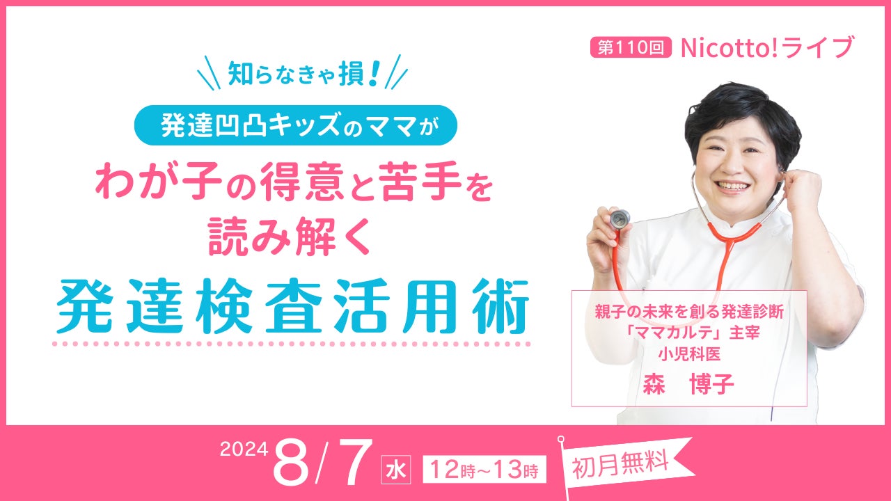 そこで、発達検査の内容を現役小児科医の森博子が詳しく解説するとともに、発達検査の正しい捉え方、脳科学的に結果を読み解き家庭で活かし子どもの成長につなげる対応をご紹介すべく、2024年8月7日にNicotto!塾で「知らなきゃ損!発達凹凸キッズのママがわが子の得意と苦手を読み解く発達検査活用術」をテーマにオンラインライブを開催します。