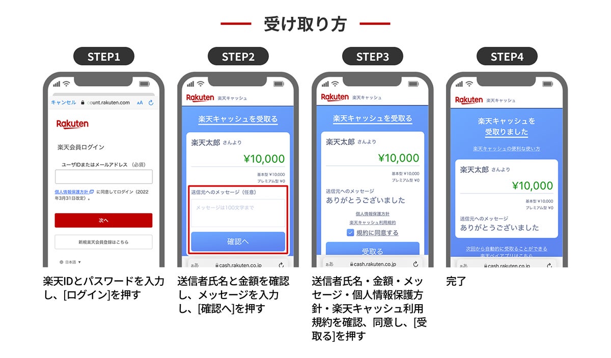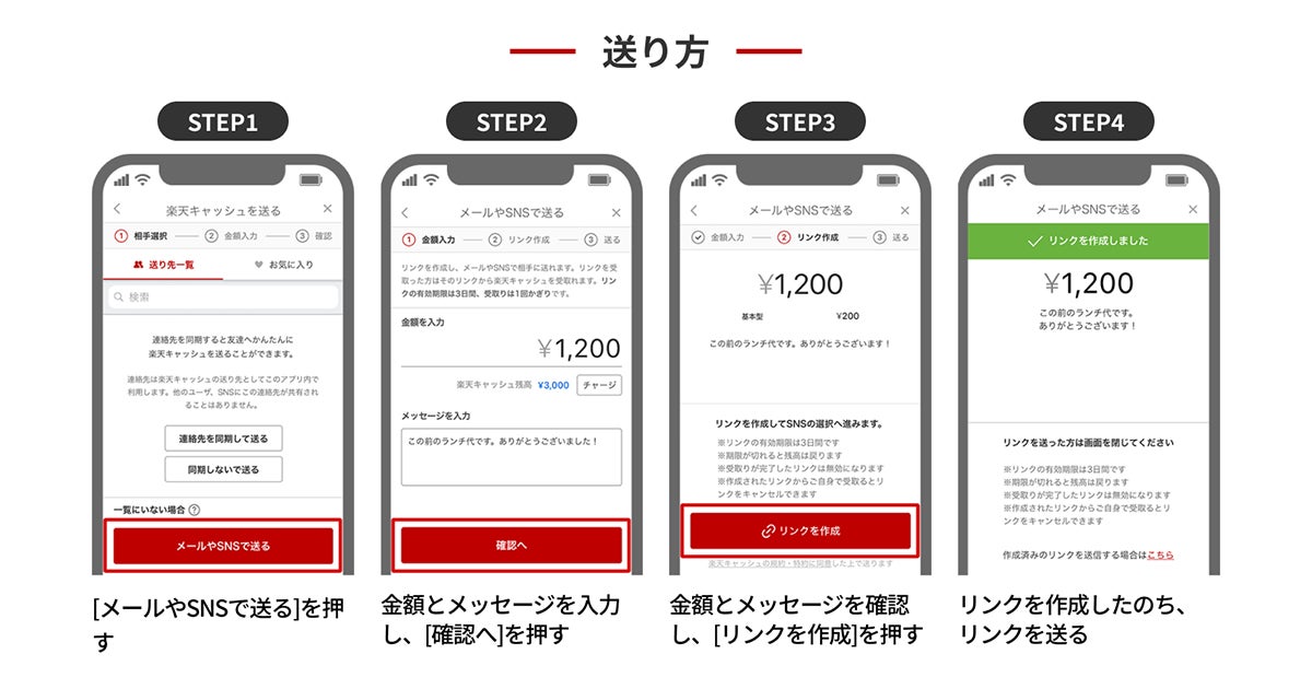【送付する方】 1. 本キャンペーンにエントリー 2. 抽選対象期間中に1回100円以上の「楽天キャッシュ」を送付 ※キャンペーン期間中であれば1・2の順序は問いません。 ※送付した方が自身で受け取りを行った取引は本キャンペーンの対象外です。 【受け取る方】 リンク(URL)で受け取る場合:有効期限内に受け取りを完了 ※リンク(URL)で送る場合、有効期限は作成した日から3日間です。キャンペーン期間中に「楽天キャッシュ」を送付し、有効期限までに受け取りを完了した場合はキャンペーンの対象となります。ただし、有効期限が切れると送付元に残高が戻り、キャンペーン対象外となりますのでご注意ください。 |