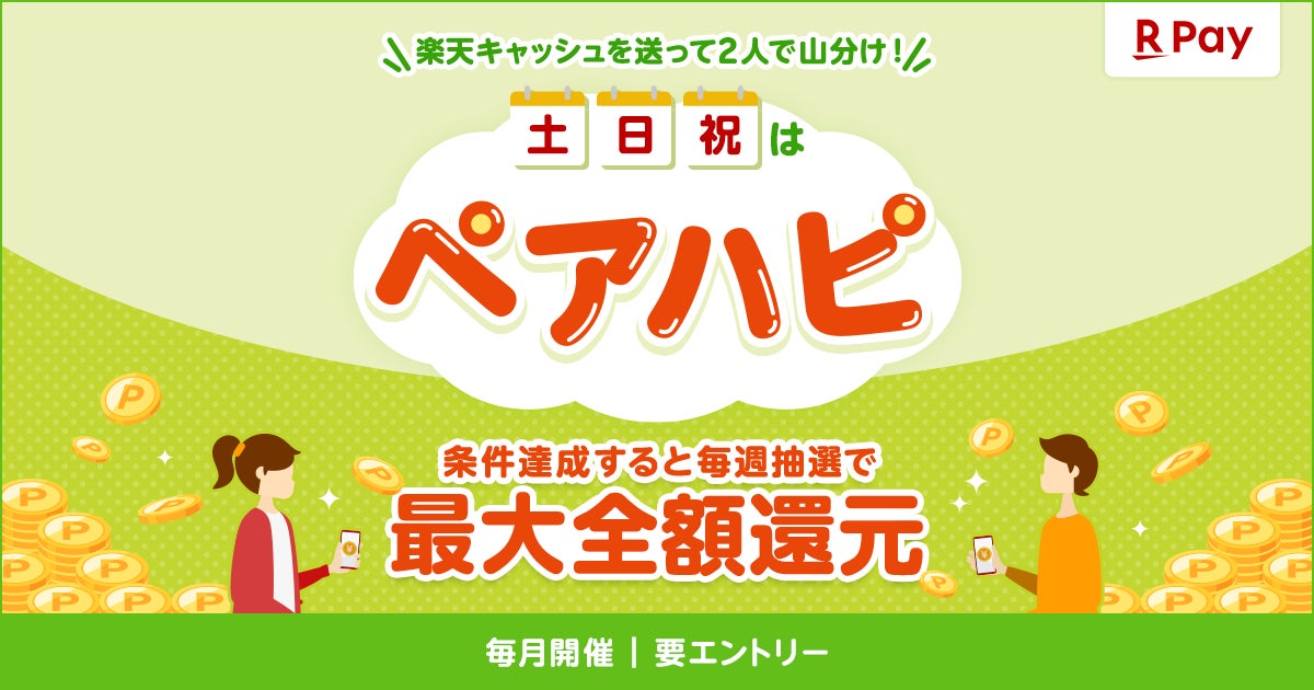 楽天ペイメント株式会社(以下「楽天ペイメント」)は、運営するキャッシュレス決済サービス「楽天ペイ」アプリにおいて、「楽天ペイ 送ってペアハピ」キャンペーンを2024年4月27日(土)から5月26日(日)までに、4回の対象期間(注1)を設けて実施することをお知らせします。また、「楽天ペイ」アプリ公式X(旧Twitter)アカウント( @RakutenPay_App )にて、楽天ペイアプリ公式X フォロー&引用ポストキャンペーン!を2024年5月3日(金)から5月9日(木)まで実施します。