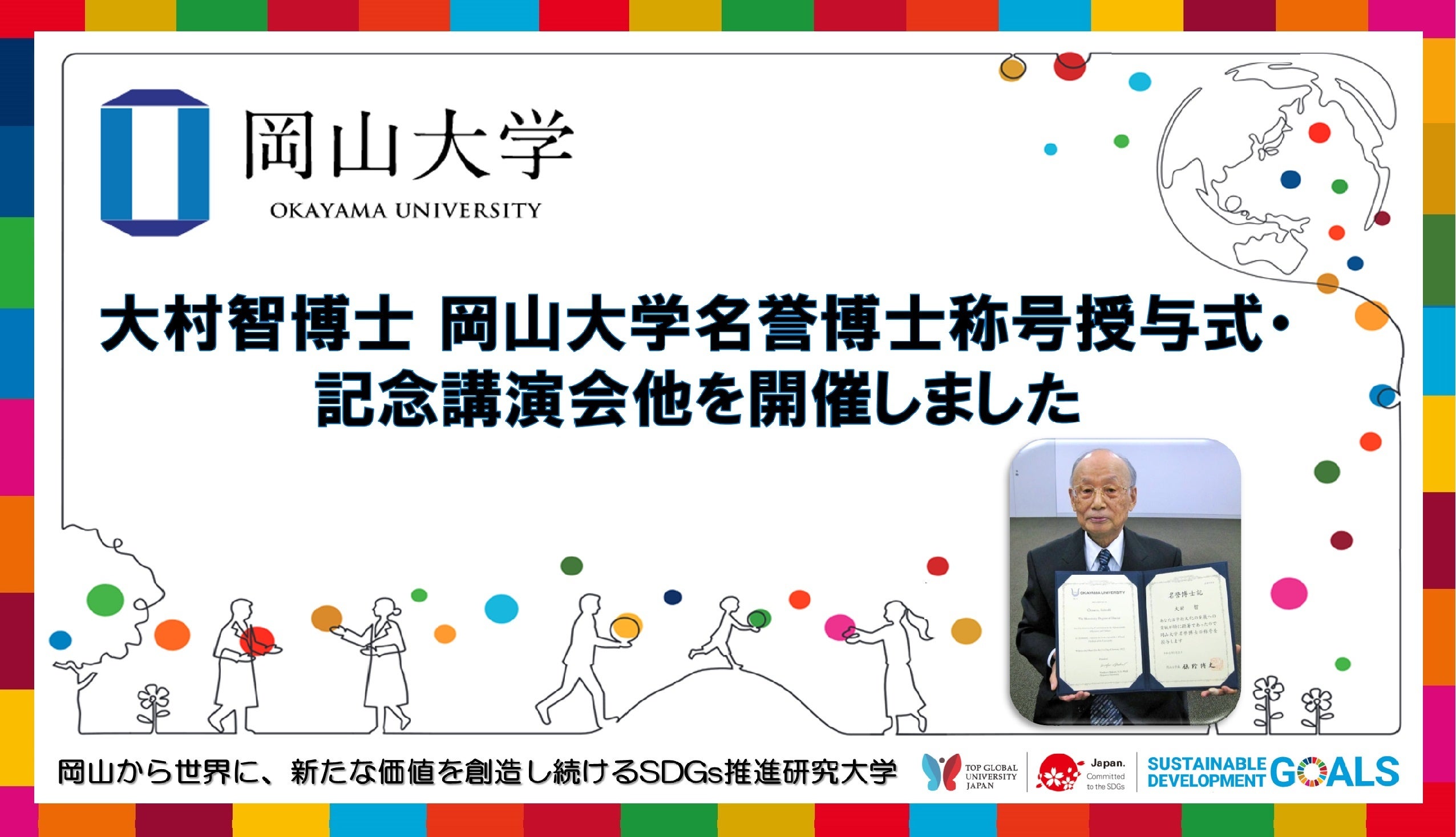 国立大学法人岡山大学(本部:岡山市北区、学長:槇野博史)は2022年1月21日、2015年ノーベル生理学・医学賞を受賞された大村智博士へ岡山大学名誉博士の称号を授与する式典を挙行し、記念講演会を開催いたしました。