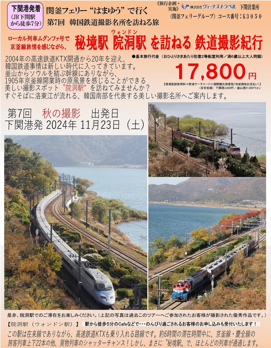 ≪下関港発着≫関釜フェリーはまゆうで行く 第7回 韓国鉄道撮影名所を訪ねる旅 ローカル列車 ムグンファ号で京釜線旅情を感じながら 秘境駅“院洞駅”を訪ねる鉄道撮影紀行 販売開始について