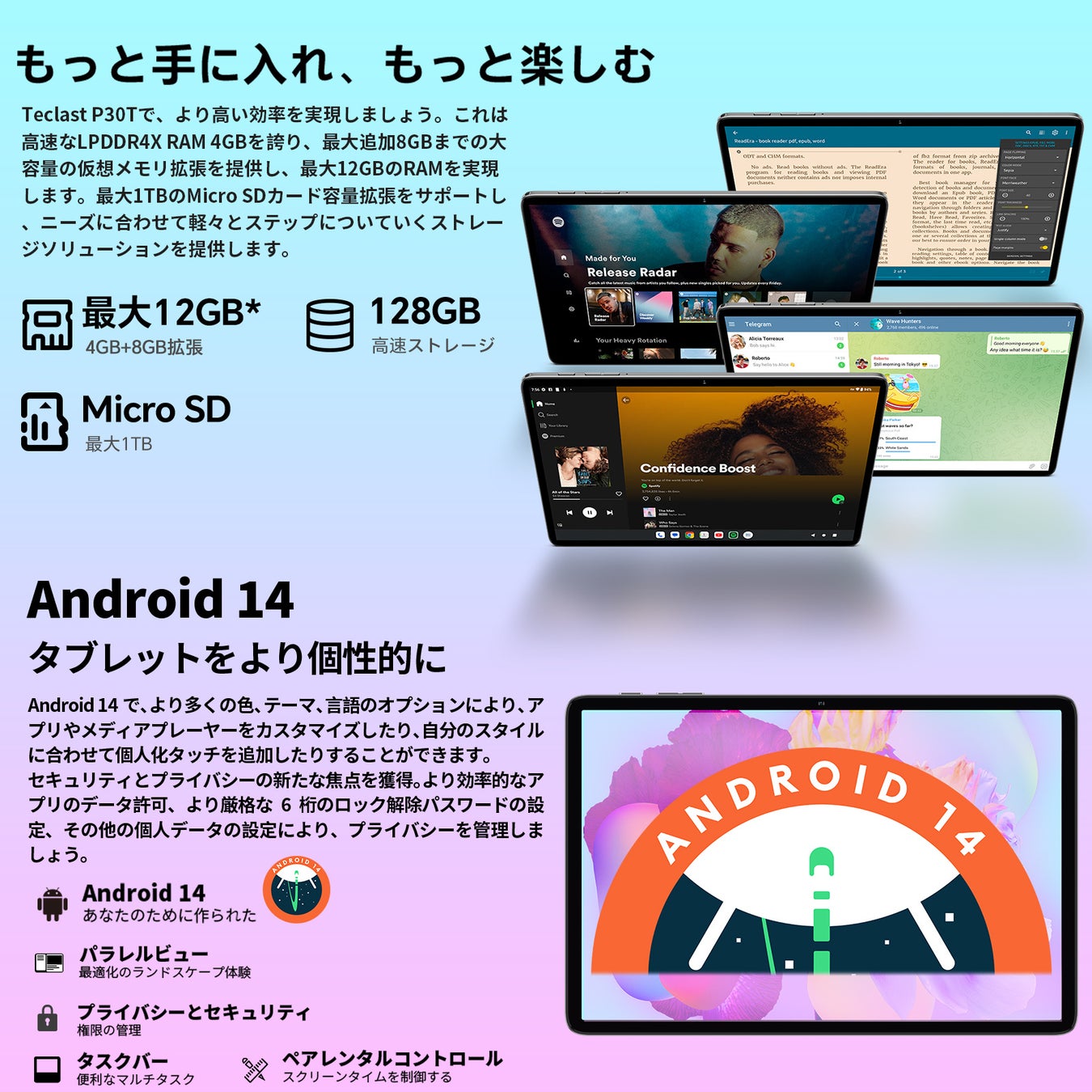 Teclast P30Tで、より高い効率を実現しましょう!これは高速なLPDDR4X RAM 4GBを誇り、最大8GBまでの仮想メモリ拡張を提供し、最大12GBのRAMを実現します。1TBのMicro SDカード容量拡張をサポートし、ニーズに合わせて軽々とステップについていくストレージソリューションを提供します。