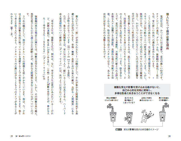 「器」とは単なる精神論ではありません。本書では、器を「現在の大きさ(Capacity)」と「変容可能性(Capability)」の両面から捉え、感情・態度・自我・認知という4象限モデルで構造的に解き明かします。 また、器が広がるプロセスを「ARCTサイクル(蓄積→認識→構想→変容)」として体系化。成長を阻む「防衛機制」の正体を明らかにしながら、個人と組織の器がどのように相互作用し、成長していくのかを解説します。