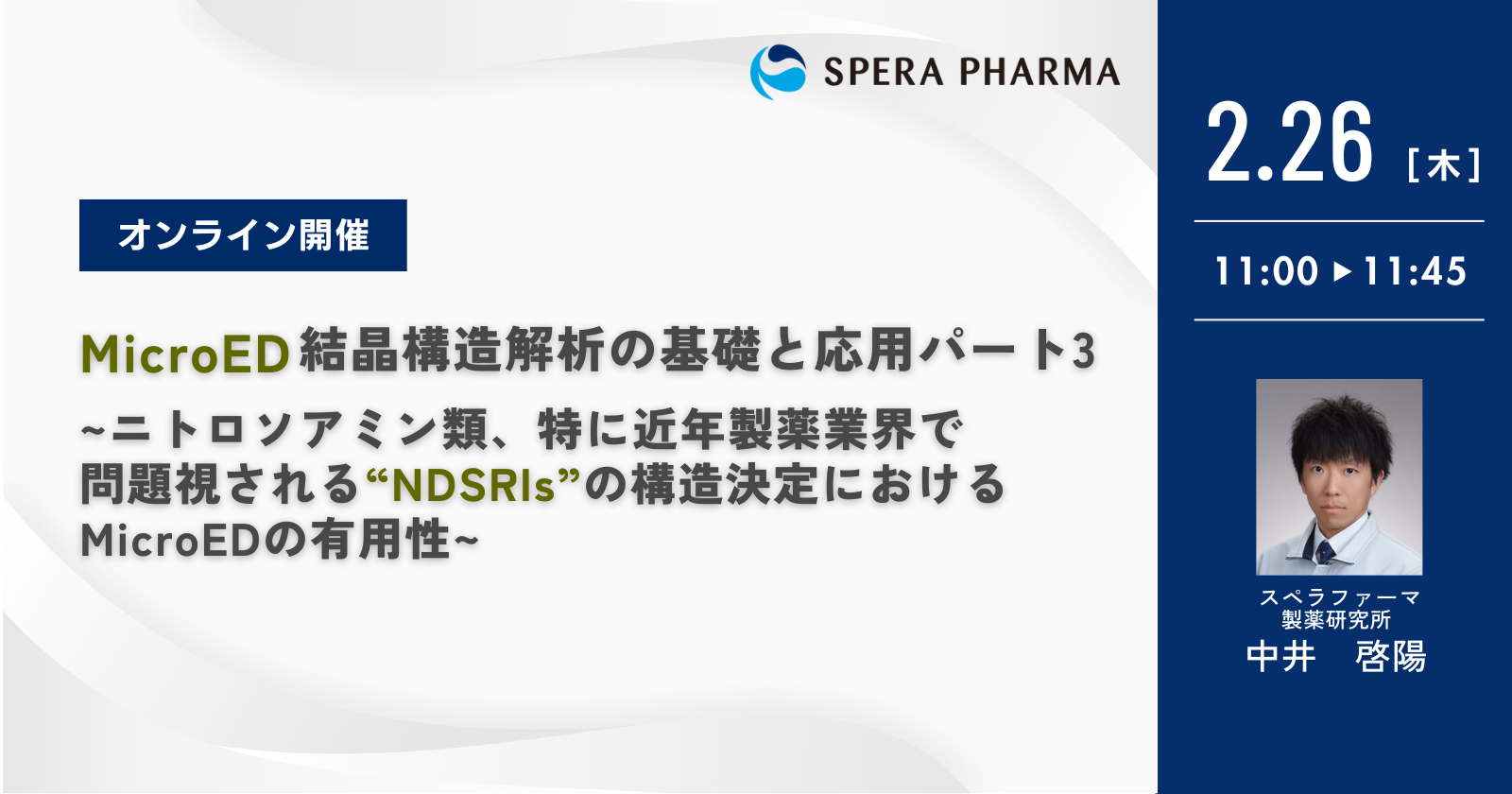 スペラファーマ株式会社(本社:大阪府大阪市、代表取締役社長:岩城 慶太郎)は、2026年2月26日(木)に「MicroED結晶構造解析の基礎と応用パート3 ~ニトロソアミン類、特に近年製薬業界で問題視される"NDSRIs"の構造決定におけるMicroEDの有用性~」ウェビナーを開催します。