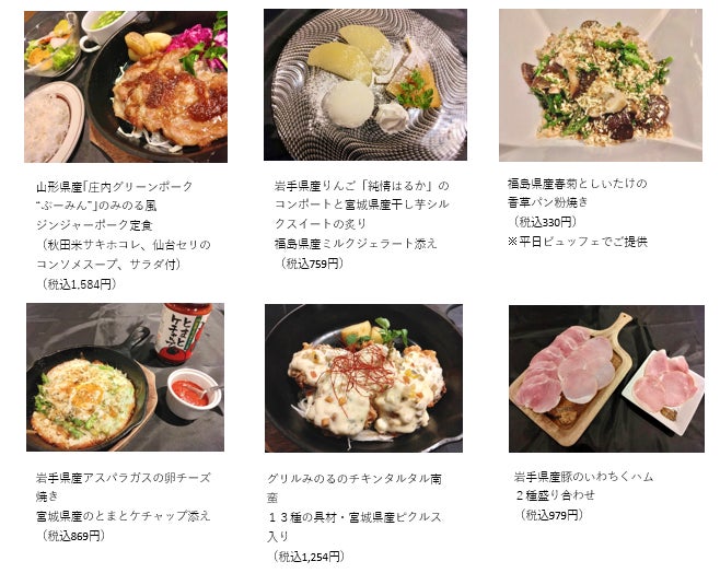 今回のフェアでは、岩手県産リンゴりんご「純情はるか」や山形県産「庄内グリーンポーク“ぶーみん”」、宮城県産「仙台セリ」など東北の食材をふんだんに使用したお食事やデザートなど特別メニューを期間限定でご提供します。